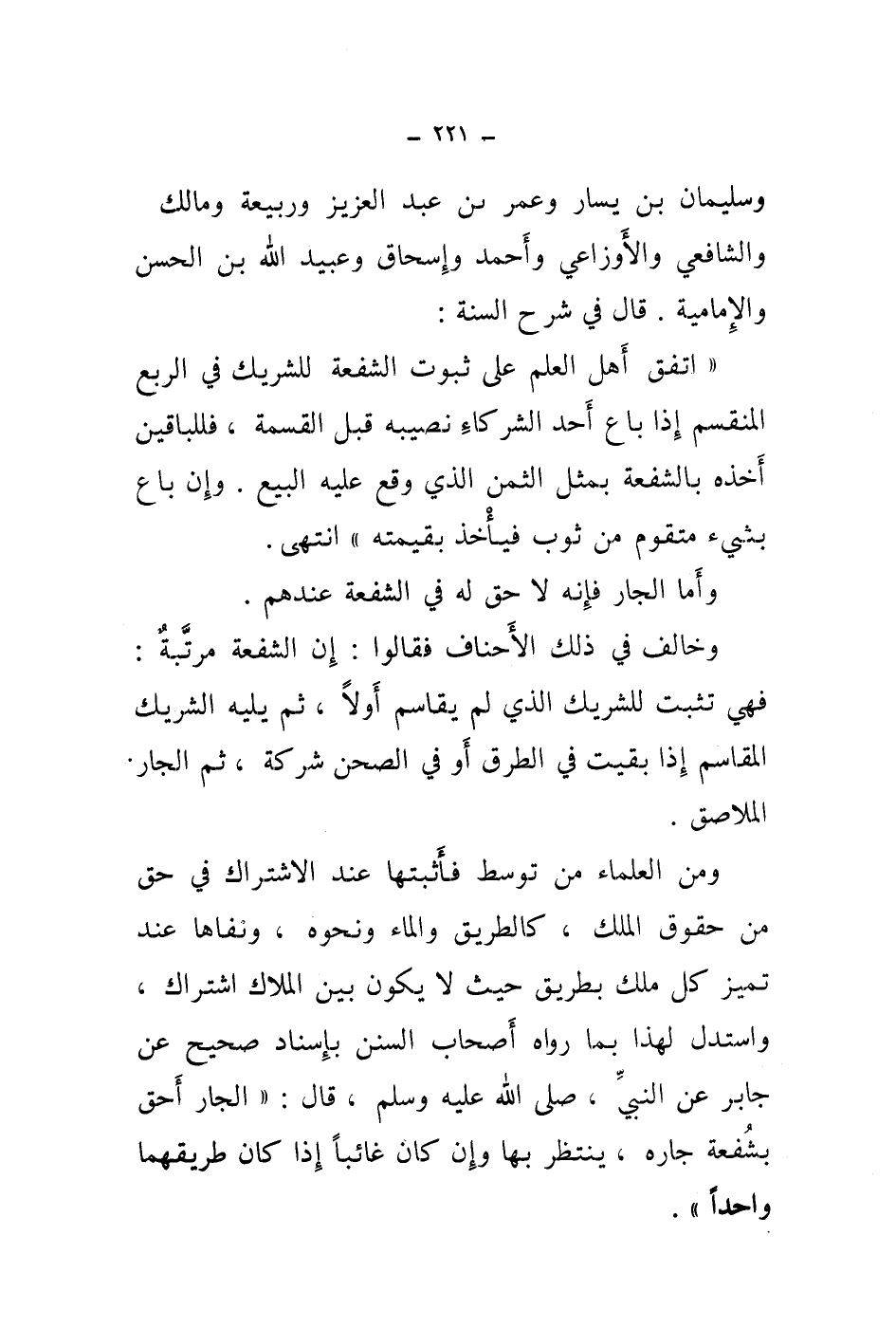 ومن العلماء من توسط فأثبتها عند الاشتراك في حق من حقوق الملك، كالطريق والماء ونحوه، ونفاها عند تميز كل ملك بطريق حيث لا يكون بين الملاك اشتراك، واستدل لهذا بما رواه أصحاب السنن بإسناده صحيح عن جابر عن النبي، صلى الله عليه وسلم، قال: " الجار أحق بشفعة جاره، ينتظر بها وإن كان غائبا إذا كان طريقهما واحدا ".