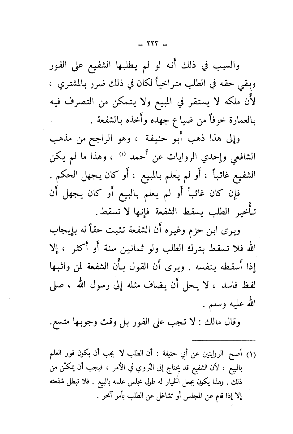 وإلى هذا ذهب أبو حنيفة، وهو الراجح من مذهب الشافعي وإحدى الروايات عن أحمد (1) ، وهذا ما لم يكن الشفيع غائبا، أو لم يعلم بالمبيع، أو كان يجهل الحكم.