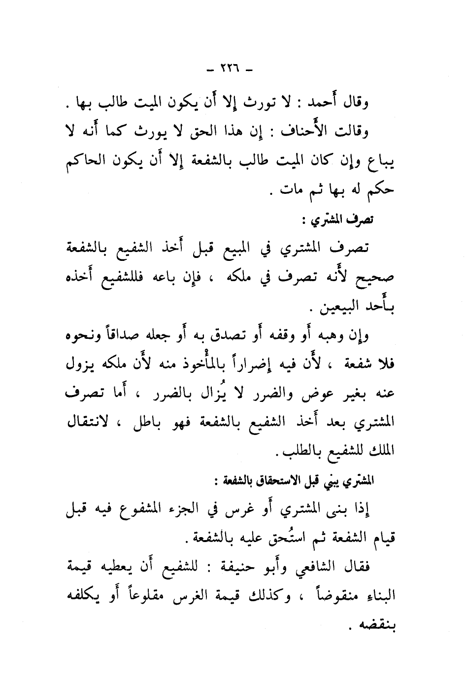 تصرف المشتري: تصرف المشتري في المبيع قبل أخذ الشفيع بالشفعة صحيح لانه تصرف في ملكه، فإن باعه فللشفيع أخذه بأحذ البيعين.