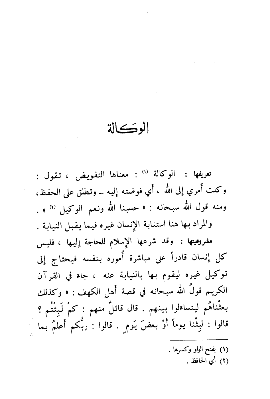 الوكالة (1) : معناها التفويض، تقول: وكلت أمري إلى الله، أي فوضته إليه - وتطلق على الحفظ، ومنه قول الله سبحانه: " حسبنا الله ونعم الوكيل (2) ".