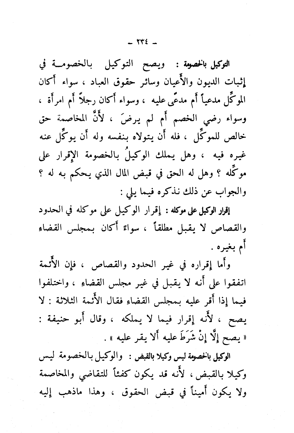 التوكيل بالخصومة: ويصح التوكيل بالخصومة في إثبات الديون والاعيان وسائر حقوق العباد، سواء أكان الموكل مدعيا أم مدعى عليه، وسواء أكان رجلا أم امرأة، وسواء رضي الخصم أم لم يرض، لان المخاصمة حق خالص للموكل، فلهأن يتولاه بنفسه وله أن يوكل عنه غيره فيه، وهل يملك الوكيل بالخصومة الاقرار على موكله؟ وهل له الحق في قبض المال الذي يحكم به له؟ والجواب عن ذلك نذكره فيما يلي: إقرار الوكيل على موكله: إقرار الوكيل على موكله في الحدود والقصاص لا يقبل مطلقا، سواء أكان بمجلس القضاء أم بغيره.