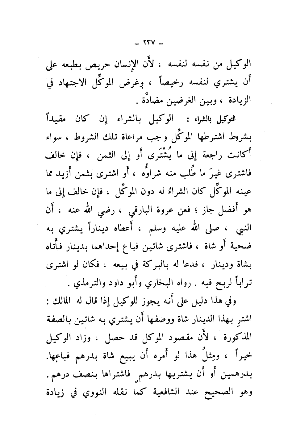 التوكيل بالشراء: الوكيل بالشراء إن كان مقيدا بشروط اشترطها الموكل وجب مراعاة تلك الشروط، سواء أكانت راجعة إلى ما يشترى أو إلى الثمن، فإن خالف فاشترى غير ما طلب منه شراؤه، أو اشترى بثمن أزيد مما عينه الموكل كان الشراء له دون الموكل، فإن خالف إلى ما هو أفضل جاز، فعن عروة البارقي، رضي الله عنه، أن النبي، صلى الله عليه وسلم، أعطاه دينارا يشتري به ضحية أو شاة، فاشترى شاتين فباع إحداهما بدينار فأتاه بشاة ودينار، فدعا له بالبركة في بيعه، فكان لو اشترى ترابا لربح فيه.