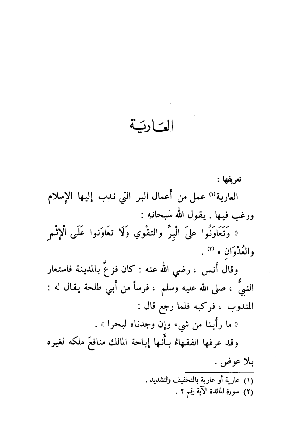 تعريفها: العارية (1) عمل من أعمال البر التي ندب إليها الاسلام ورغب فيها.