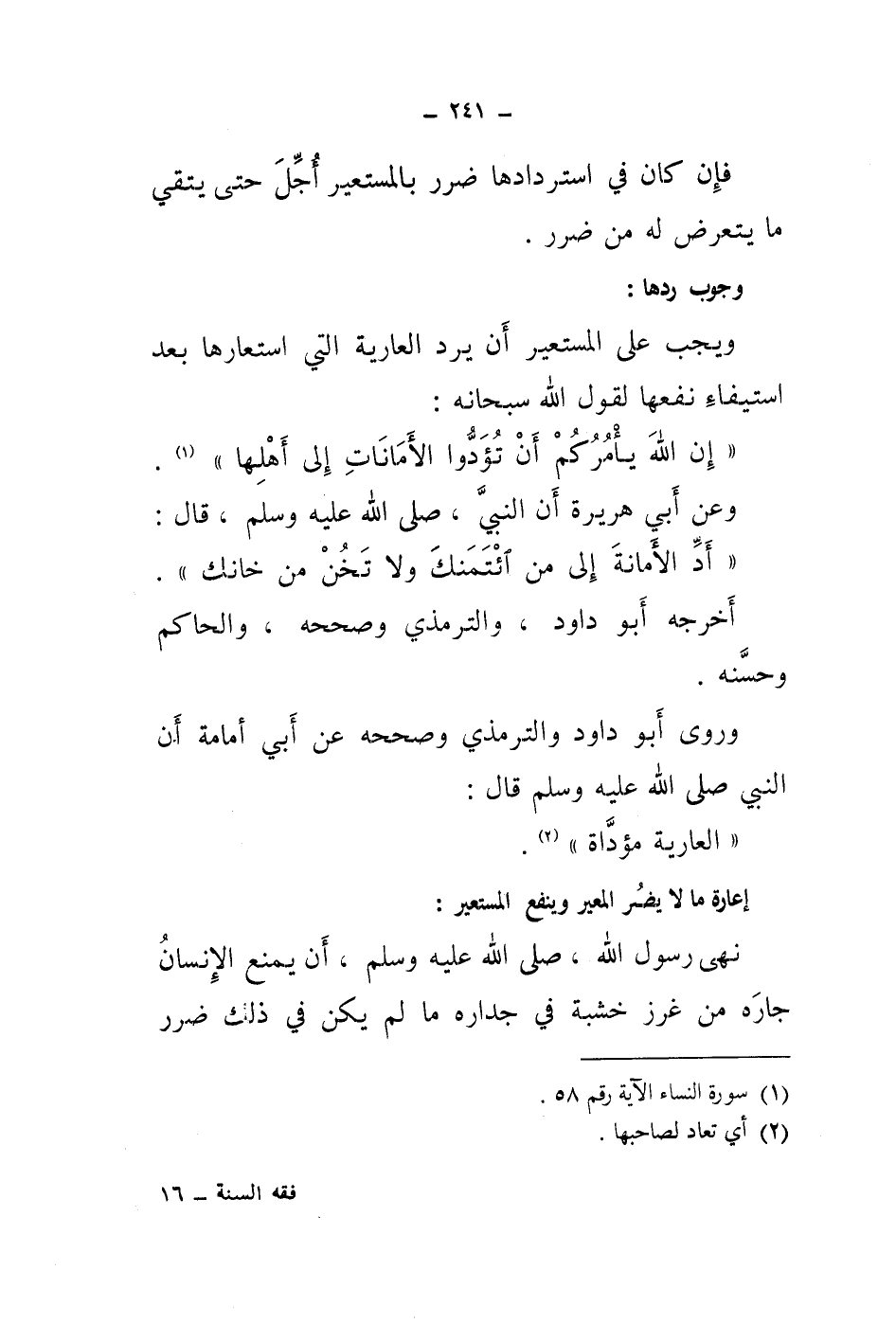 وروى أبو داود والترمذي وصححه عن أبي أمامة أن النبي صلى الله عليه وسلم قال: " العارية مؤداة " (2) .