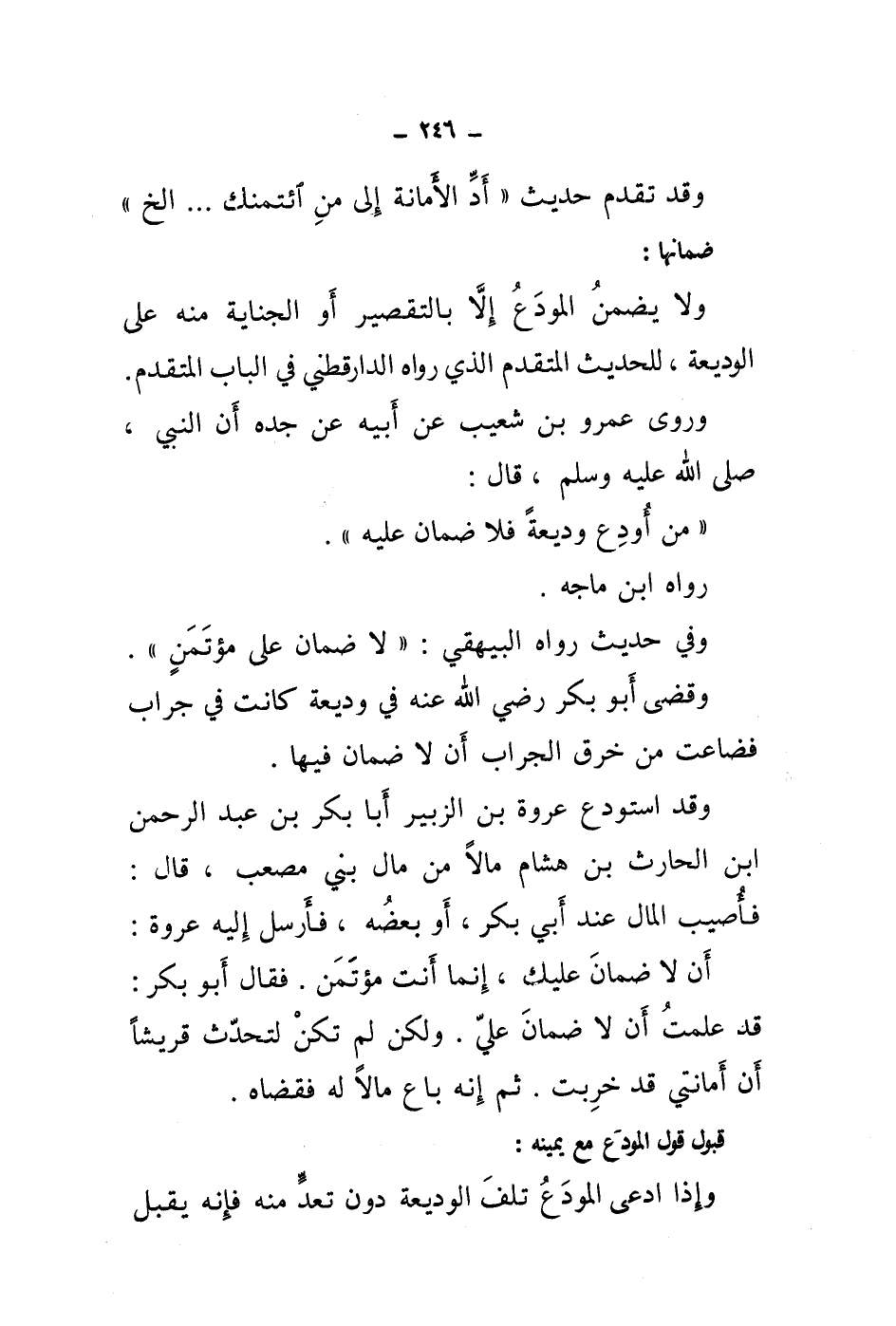 وقد استودع عروة بن الزبير أبا بكر بن عبد الرحمن ابن الحارث بن هشام ما لا من مال بني مصعب، قال: فأصيب المال عند أبي بكر، أو بعضه، فأرسل إليه عروة: أن لا ضمان عليك، إنما أنت مؤتمن.