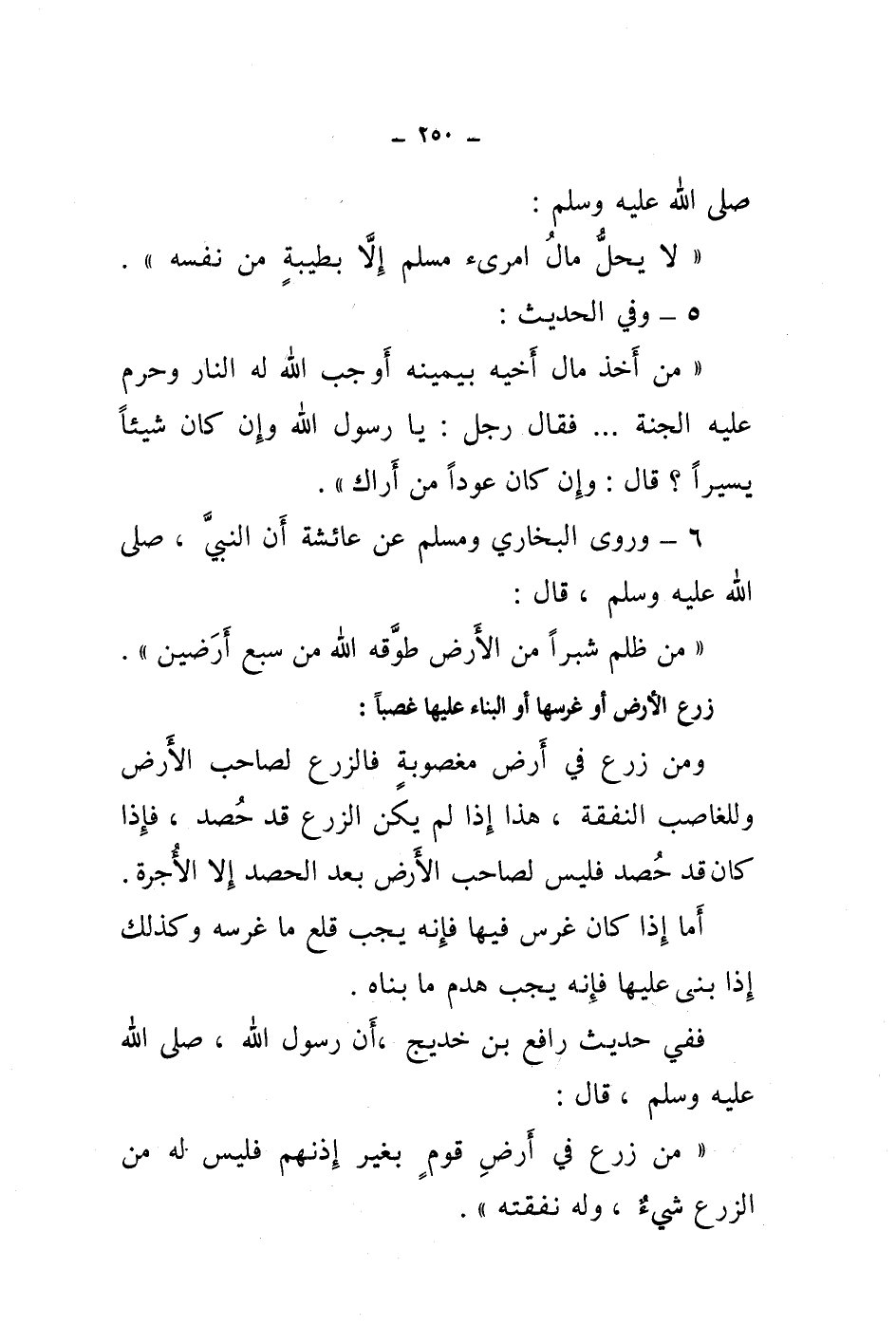 6 - وروى البخاري ومسلم عن عائشة أن النبي، صلى الله عليه وسلم، قال: " من ظلم شبرا من الارض طوقه الله من سبع أرضين ".
