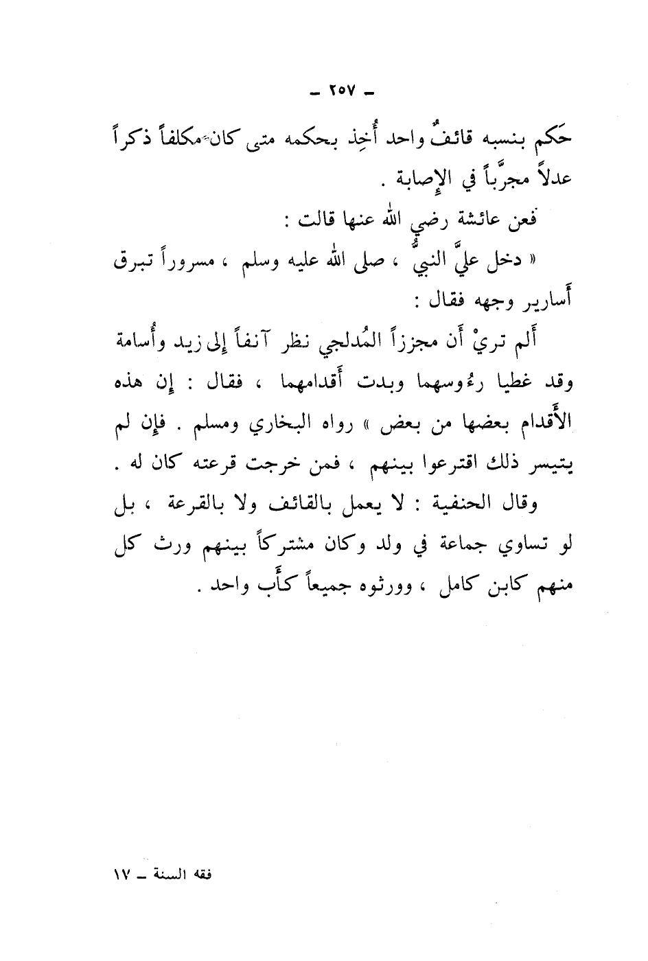 فعن عائشة رضي الله عنها قالت: " دخل علي النبي، صلى الله عليه وسلم، مسرور اتبرق أسارير وجهه فقال: ألم تري أن مجززا المدلجي نظر آنفا إلى زيد وأسامة وقد غطيا رؤوسهما وبدت أقدامهما، فقال: إن هذه الاقدام بعضها من بعض " رواه البخاري ومسلم.