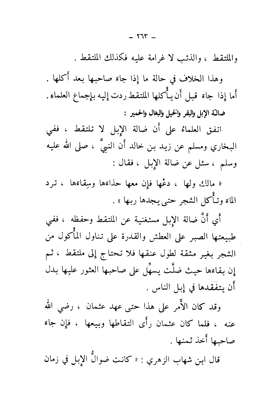 اتفق العلماء على أن ضالة الابل لا تلتقط، ففي البخاري ومسلم عن زيد بن خالد أن النبي، صلى الله عليه وسلم، سئل عن ضالة الابل، فقال: " مالك ولها، دعها فإن معها حذاءها وسقاءها، ترد الماء وتأكل الشجر حتى يجدها ربها ".