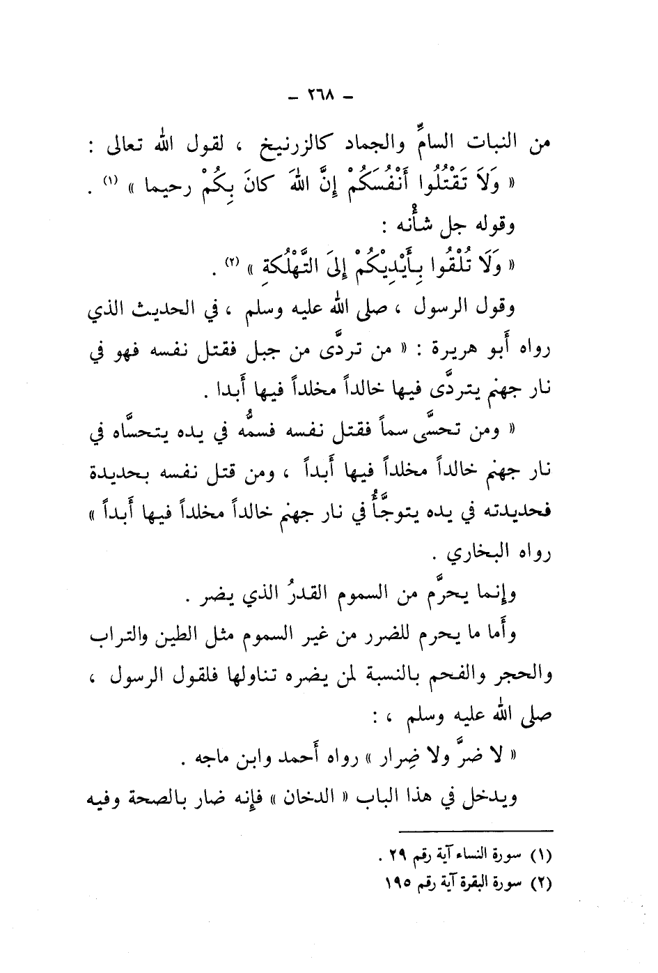 من النبات السام والجماد كالزرنيخ، لقول الله تعالى: " ولا تقتلوا أنفسكم إن الله كان بكم رحيما " (1) .