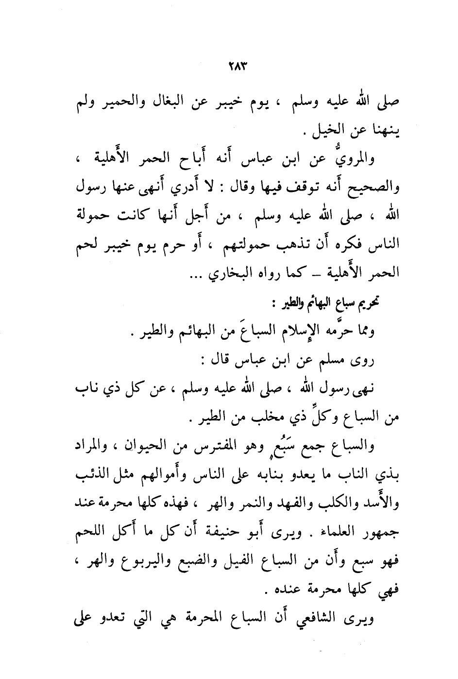 روى مسلم عن ابن عباس قال: نهى رسول الله، صلى الله عليه وسلم، عن كل ذي ناب من السباع وكل ذي مخلب من الطير.