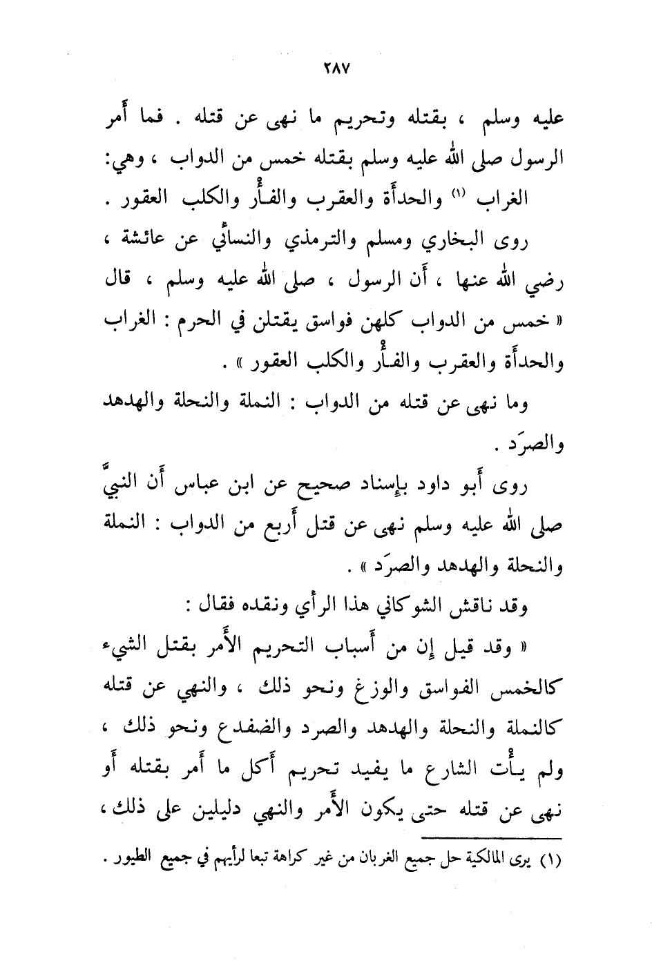 وقد ناقش الشوكاني هذا الرأي ونقده فقال: " وقد قيل إن من أسباب التحريم الامر بقتل الشئ كالخمس الفواسق والوزغ ونحو ذلك، والنهي عن قتله كالنملة والنحلة والهدهد والصرد والضفدع ونحو ذلك،