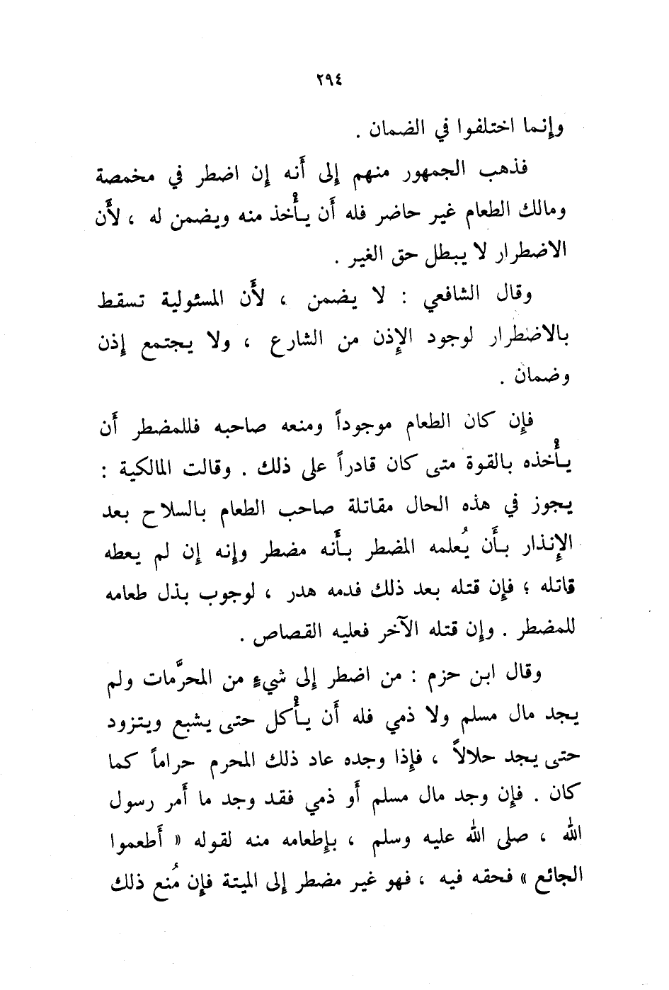 وقال الشافعي: لا يضمن، لان المسئولية تسقط بالاضطرار لوجود الاذن من الشارع، ولا يجتمع إذن وضمان.