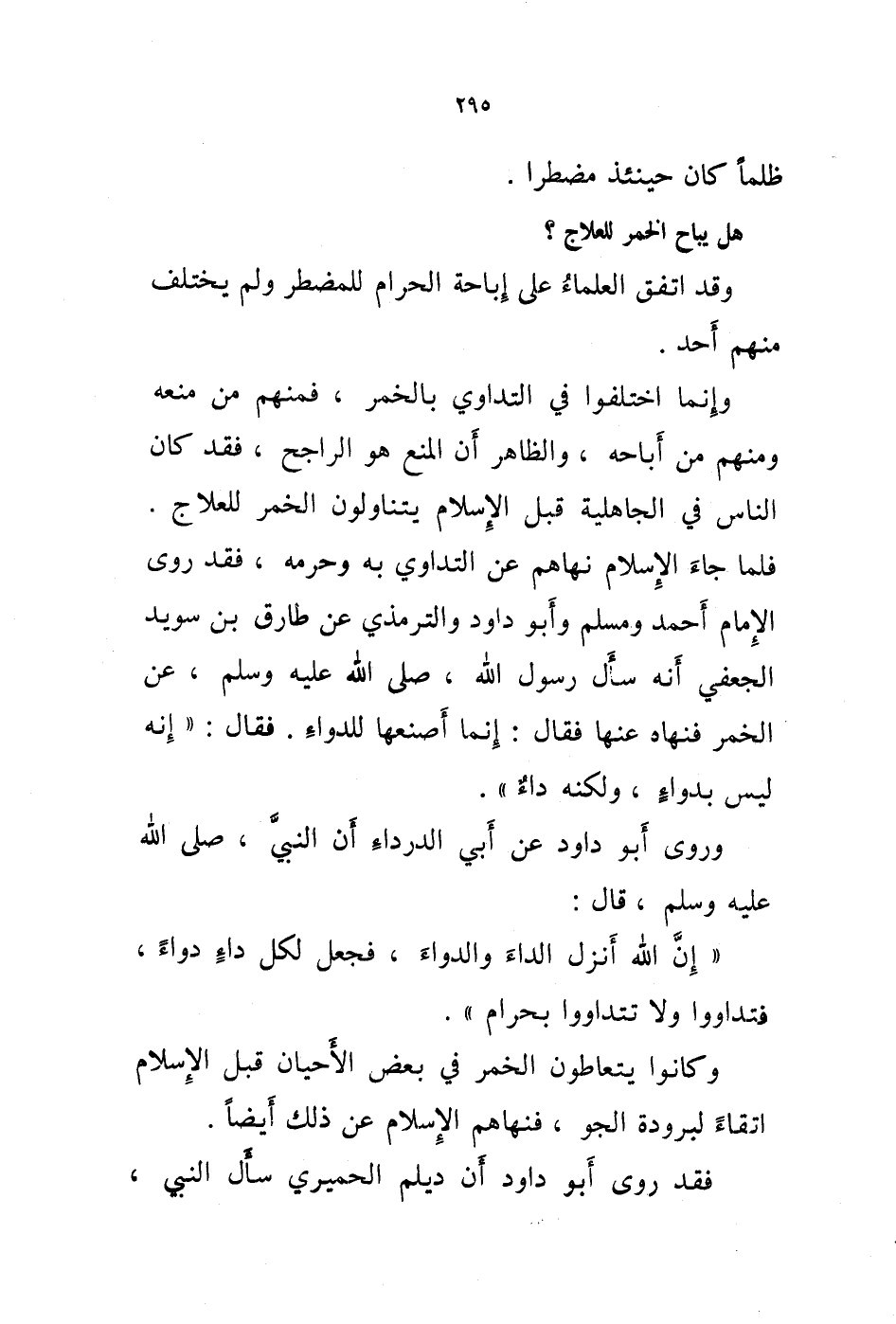 وإنما اختلفوا في التداوي بالخمر، فمنهم من منعه ومنهم من أباحه، والظاهر أن المنع هو الراجح، فقد كان الناس في الجاهلية قبل الاسلام يتناولون الخمر للعلاج. فلما جاء الاسلام نهاهم عن التداوي به وحرمه، فقد روى الامام أحمد ومسلم وأبو داود والترمذي عن طارق بن سويد الجعفي أنه سأل رسول الله، صلى الله عليه وسلم، عن الخمر فنهاه عنها فقال: إنما أصنعها للدواء. فقال: " إنه ليس بدواء، ولكنه داء ".