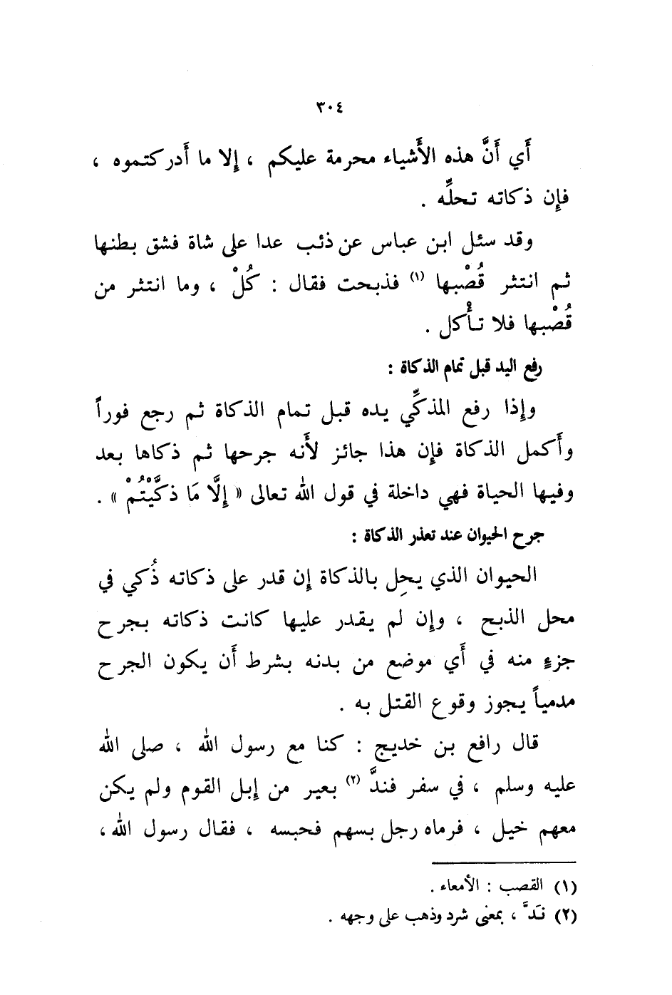 قال رافع بن خديج: كنا مع رسول الله، صلى الله عليه وسلم، في سفر فند (2) بعير من إبل القوم ولم يكن معهم خيل، فرماه رجل بسهم فحبسه، فقال رسول الله،