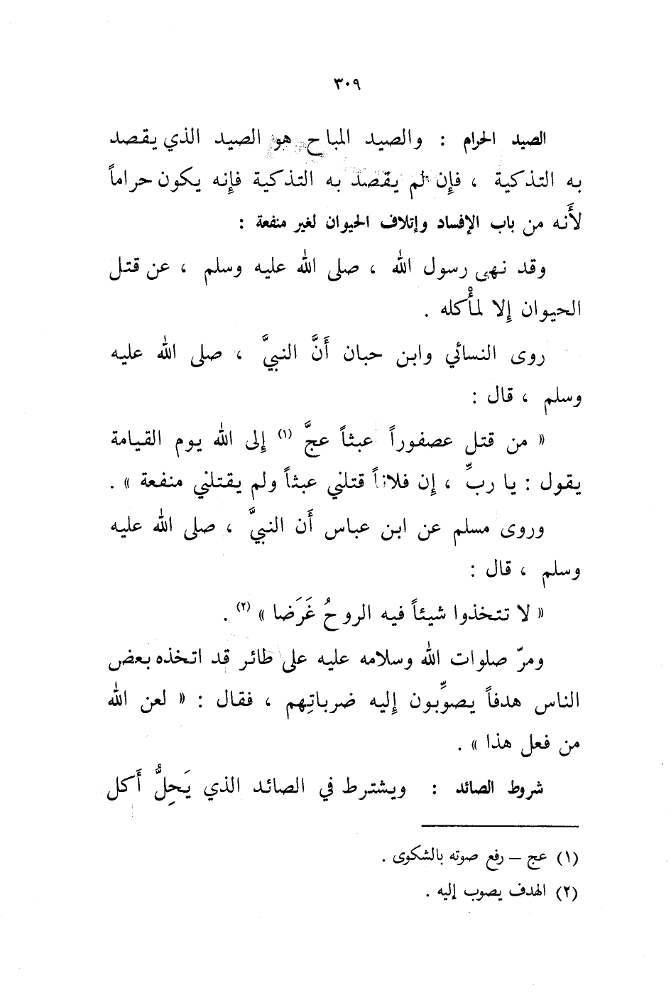 والصيد المباح هو الصيد الذي يقصد به التذكية، فإن لم يقصد به التذكية فإنه يكون حراما لانه من باب الافساد وإتلاف الحيوان لغير منفعة: وقد نهى رسول الله، صلى الله عليه وسلم، عن قتل الحيوان إلا لمأكله.