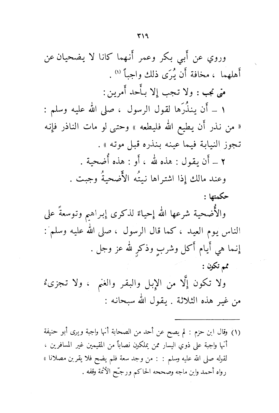 (1) وقال ابن حزم: لم يصح عن أحد من الصحابة أنها واجبة ويرى أبو حنيفة أنها واجبة على ذوي اليسار ممن يملكون نصابا من المقيمين غير المسافرين، لقوله صلى الله عليه وسلم:: من وجد سعة فلم يضح فلا يقربن مصلانا " رواه أحمد وابن ماجه وصححه الحاكم ورجح الائمة وقفه.