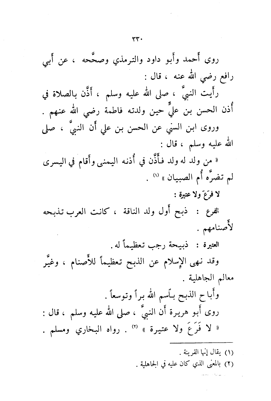 روى أبو هريرة أن النبي، صلى الله عليه وسلم، قال: " لا فرع ولا عتيرة " (2) .