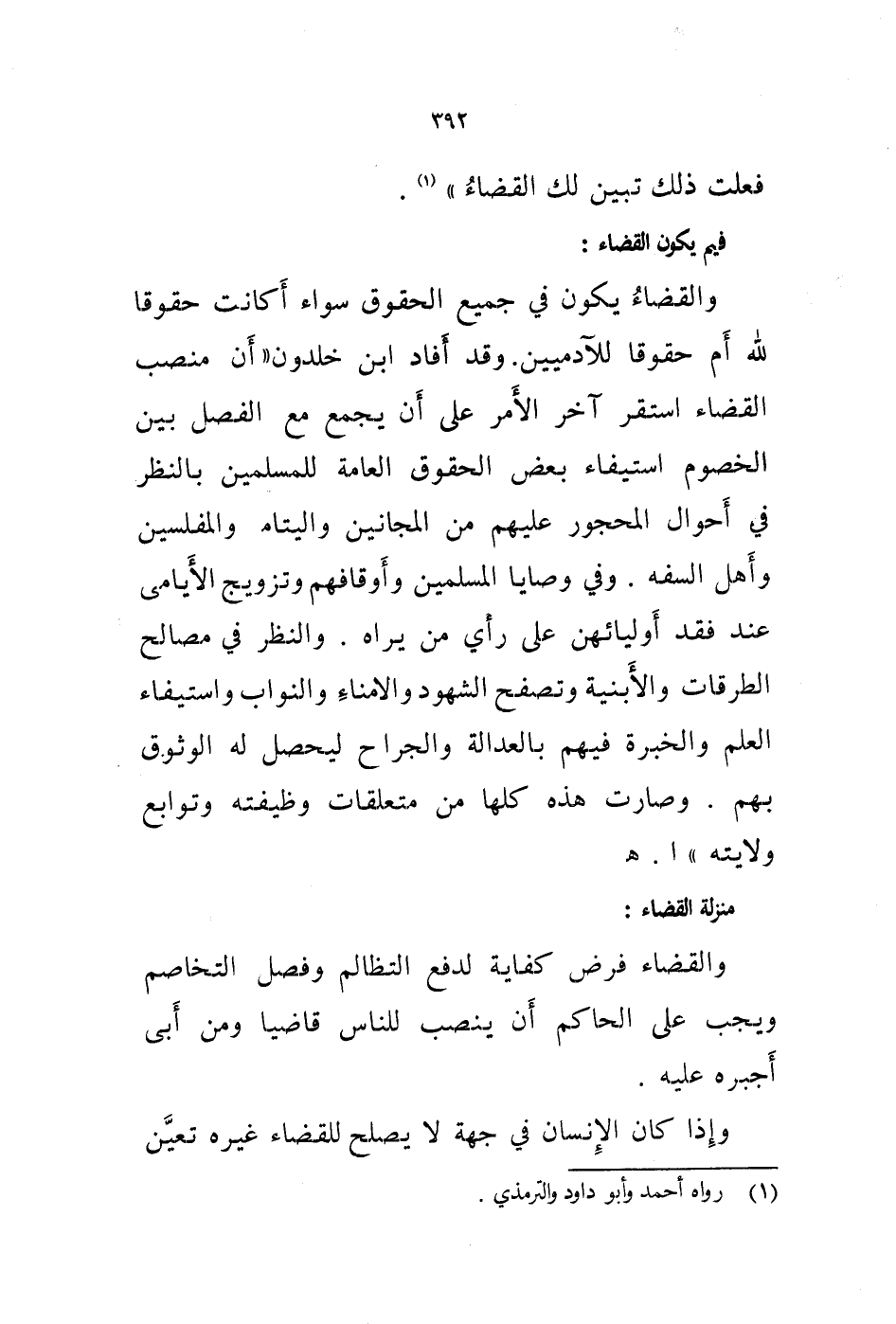 وقد أفاد ابن خلدون " أن منصب القضاء استقر آخر الامر على أن يجمع مع الفصل بين الخصوم استيفاء بعض الحقوق العامة للمسلمين بالنظر في أحوال المحجور عليهم من المجانين واليتام والمفلسين وأهل السفه.