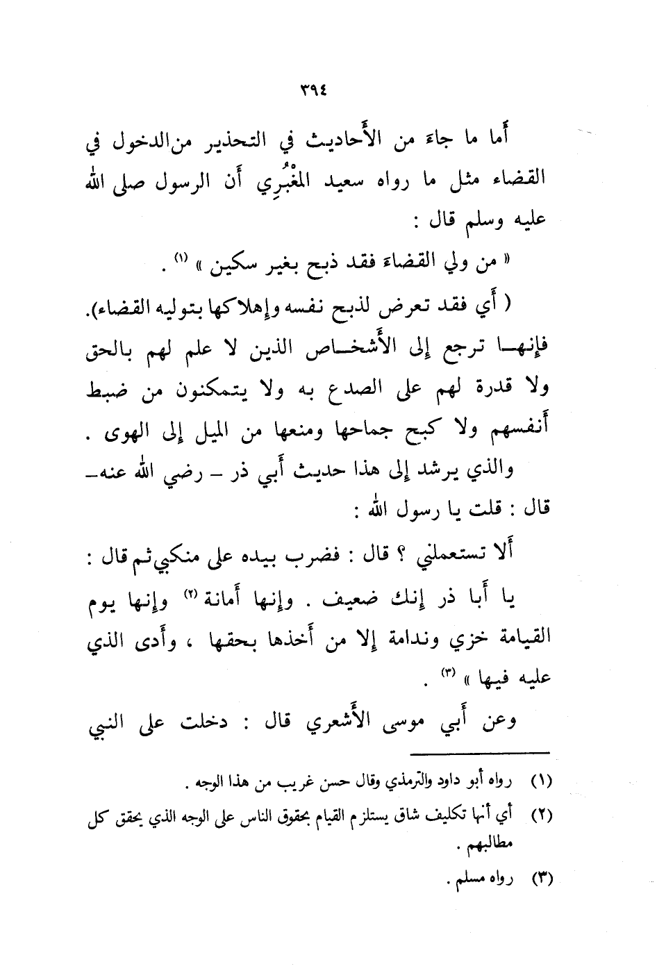 أما ما جاء من الاحاديث في التحذير من الدخول في القضاء مثل ما رواه سعيد المغبري أن الرسول صلى الله عليه وسلم قال: " من ولي القضاء فقد ذبح بغير سكين " (1) . (أي فقد تعرض لذبح نفسه وإهلاكها بتوليه القضاء) .