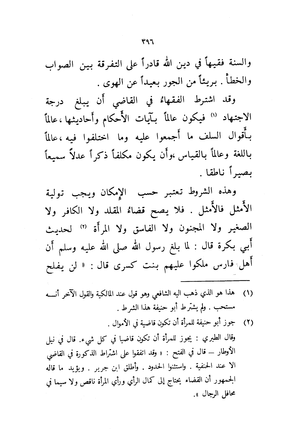 (2) جوز أبو حنيفة للمرأة أن تكون قاضية في الاموال. وقال الطبري: يجوز للمرأة أن تكون قاضيا في كل شئ. قال في نيل الاوطار - قال في الفتح: " وقد اتفقوا على اشتراط الذكورة في القاضي الا عند الحنفية. واستثنوا الحدود. وأطلق ابن جرير. ويؤيد ما قاله الجمهور أن القضاء يحتاج إلى كمال الرأي ورأي المرأة ناقص ولاسيما في محافل الرجال "