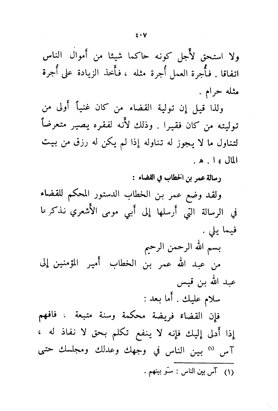 أما بعد: فإن القضاء فريضة محكمة وسنة متبعة، فافهم إذا أدلى إليك فإنه لا ينفع تكلم بحق لانفاذ له، آس (1) بين الناس في وجهك وعدلك ومجلسك حتى