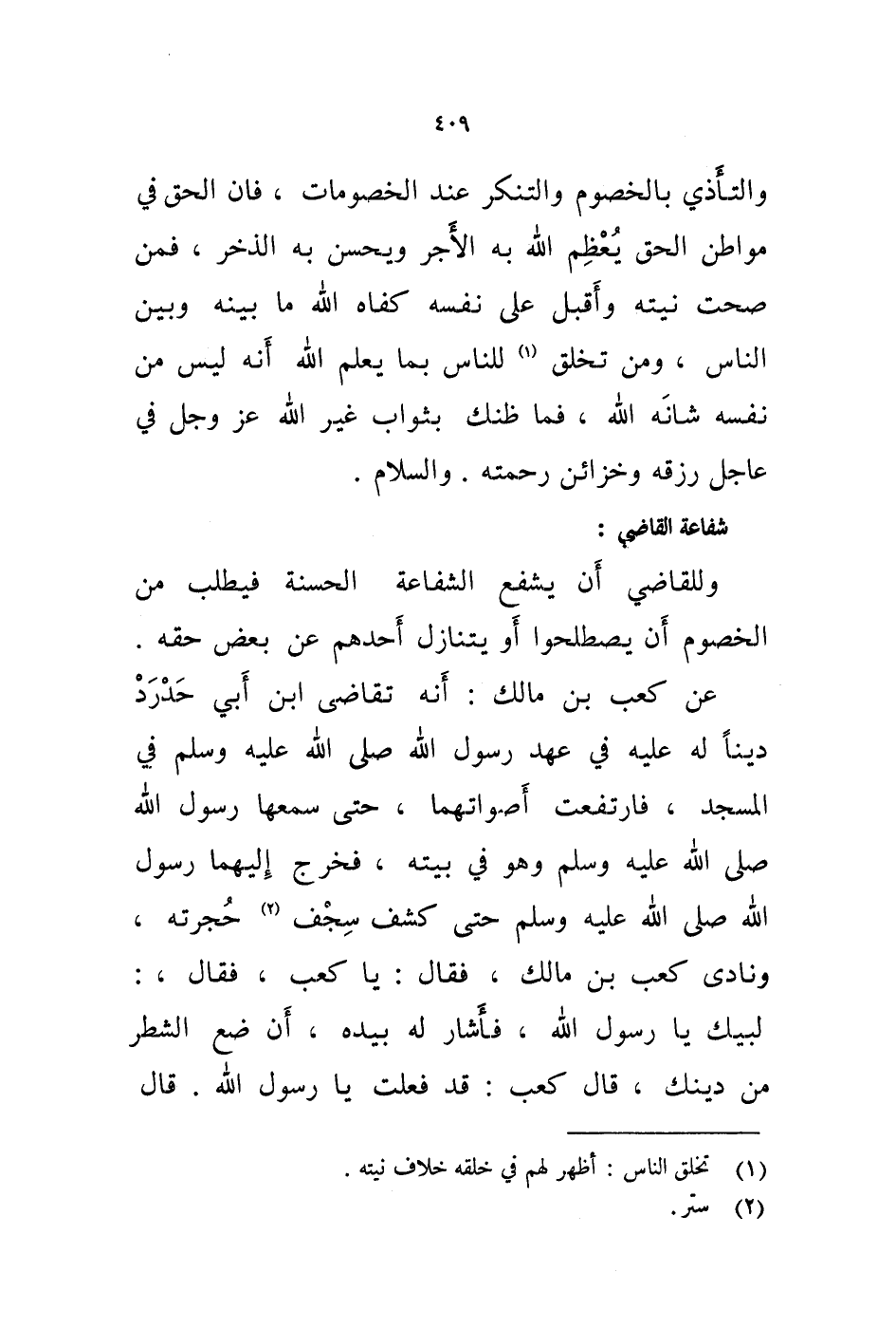 عن كعب بن مالك: أنه تقاضى ابن أبي حدرد دينا له عليه في عهد رسول الله صلى الله عليه وسلم في المسجد، فارتفعت أصواتهما، حتى سمعها رسول الله صلى الله عليه وسلم وهو في بيته، فخرج إليهما رسول الله صلى الله عليه وسلم حتى كشف سجف (2) حجرته، ونادى كعب بن مالك، فقال: يا كعب، فقال،: لبيك يارسول الله، فأشار له بيده، أن ضع الشطر من دينك، قال كعب: قد فعلت يا رسول الله.