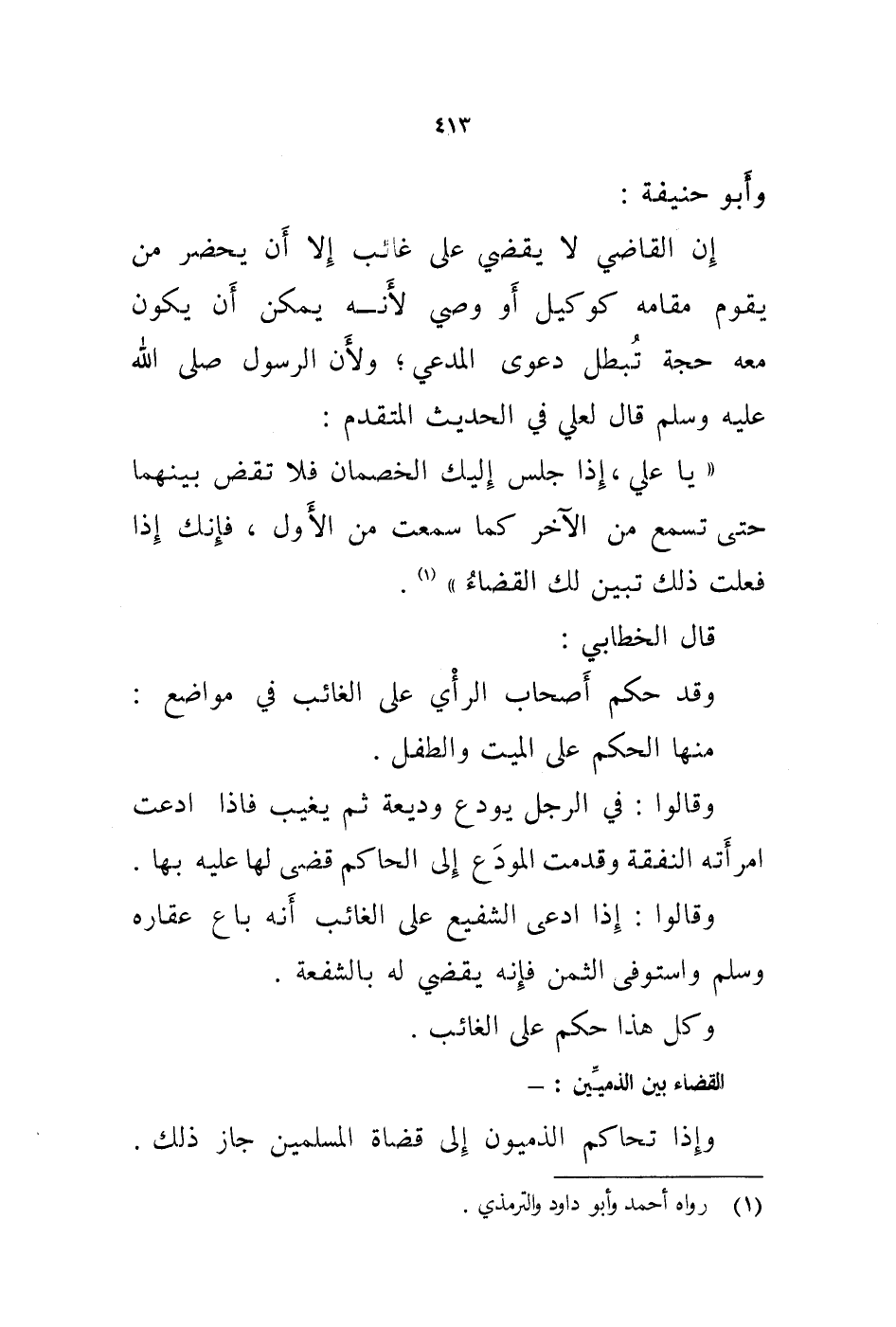 وأبو حنيفة: إن القاضي لا يقضي على غائب إلا أن يحضر من يقوم مقامه كوكيل أو وصي لانه يمكن أن يكون معه حجة تبطل دعوى المدعي، ولان الرسول صلى الله عليه وسلم قال لعلي في الحديث المتقدم: " يا علي، إذا جلس إليك الخصمان فلا تقض بينهما حتى تسمع من الاخر كما سمعت من الاول، فإنك إذا فعلت ذلك تبين لك القضاء " (1) .
