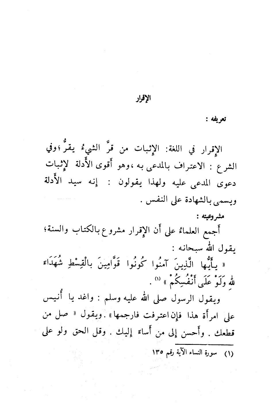 مشروعيته: أجمع العلماء على أن الاقرار مشروع بالكتاب والسنة، يقول الله سبحانه: " يا أيها الذين آمنوا كونوا قوامين بالقسط شهداء لله ولو على أنفسكم " (1) .