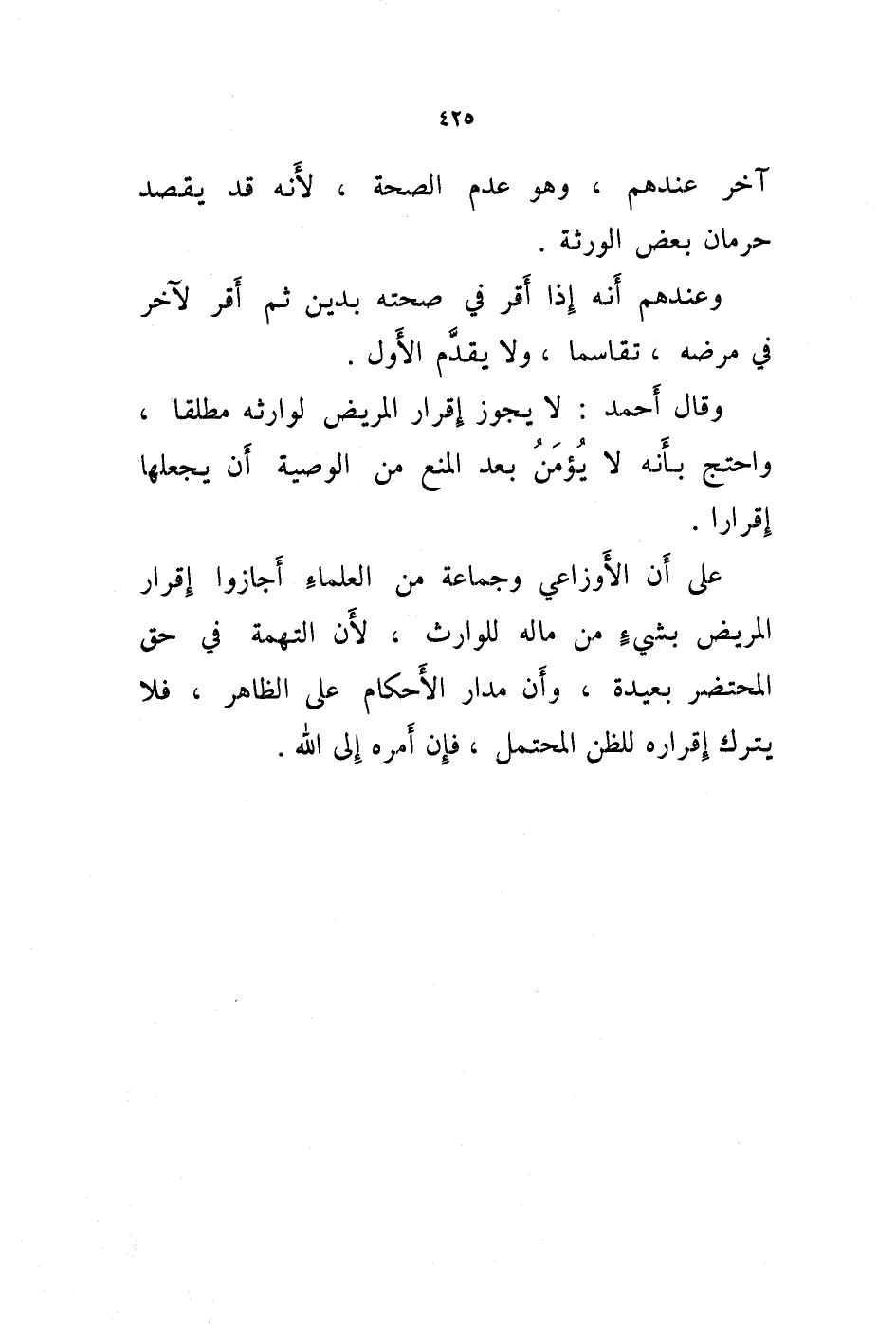على أن الاوزاعي وجماعة من العلماء أجازوا إقرار المريض بشئ من ماله للوارث، لان التهمة في حق المحتضر بعيدة، وأن مدار الاحكام على الظاهر، فلا يترك إقراره للظن المحتمل، فإن أمره إلى الله.