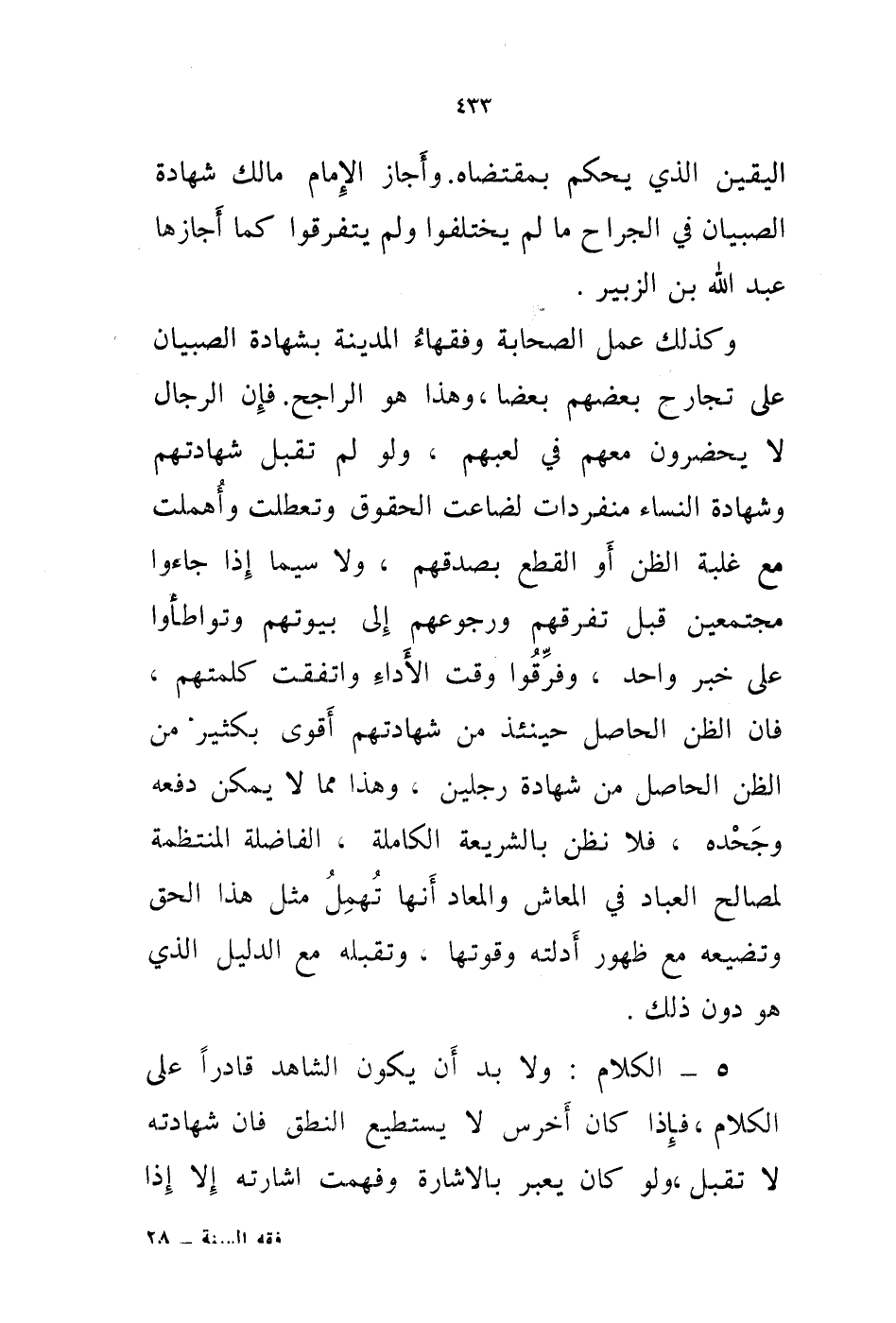 فإن الرجال لا يحضرون معهم في لعبهم، ولو لم تقبل شهادتهم وشهادة النساء منفردات لضاعت الحقوق وتعطلت وأهملت مع غلبة الظن أو القطع بصدقهم، ولاسيما إذا جاءوا مجتمعين قبل تفرقهم ورجوعهم إلى بيوتهم وتواطأوا على خبر واحد، وفرقوا وقت الاداء واتفقت كلمتهم، فان الظن الحاصل حينئذ من شهادتهم أقوى بكثير من الظن الحاصل من شهادة رجلين، وهذا مما لا يمكن دفعه وجحده، فلا نظن بالشريعة الكاملة، الفاضلة المنتظمة لمصالح العباد في المعاش والمعاد أنها تهمل مثل هذا الحق وتضيعه مع ظهور أدلته وقوتها، وتقبله مع الدليل الذي هو دون ذلك.