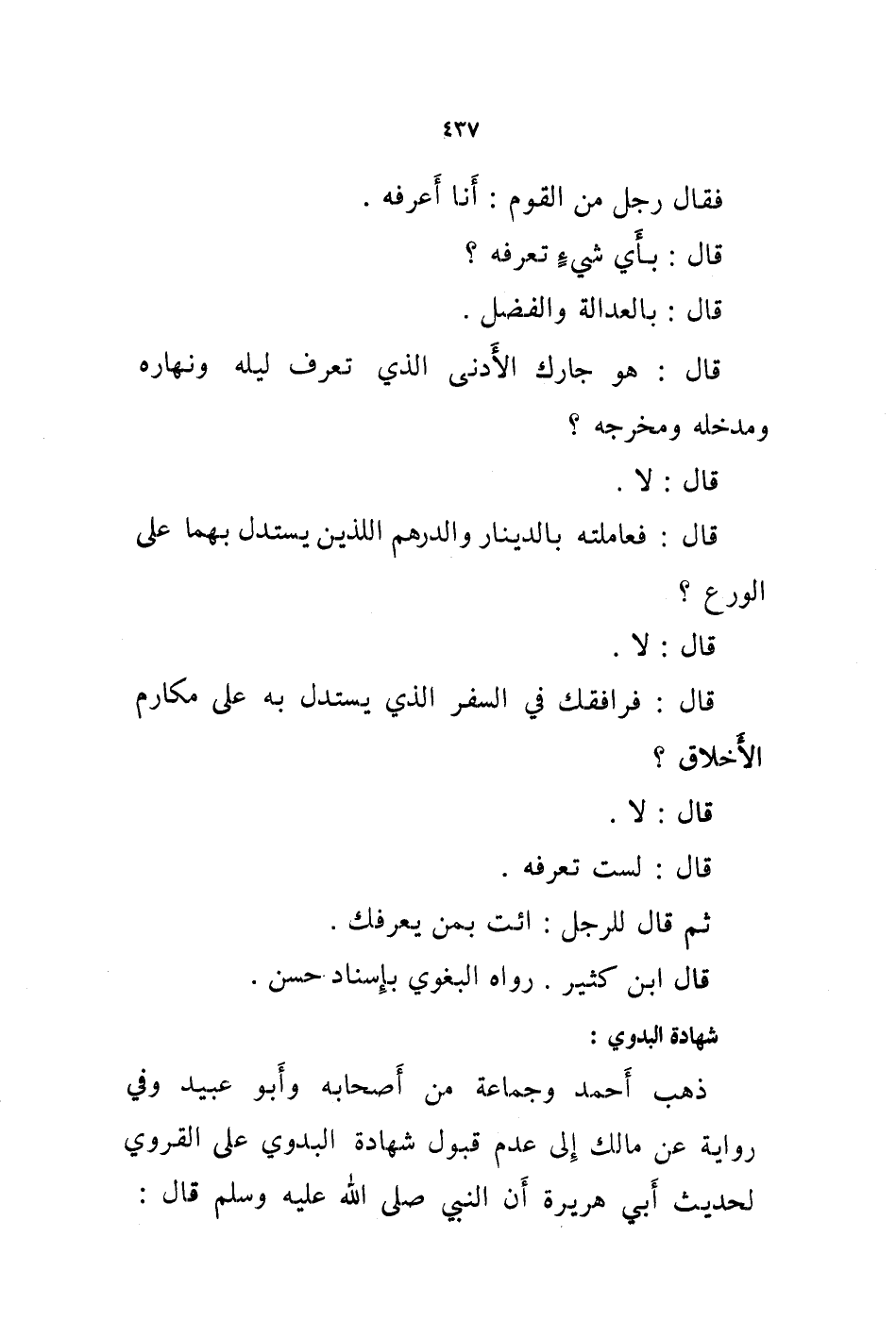 ذهب أحمد وجماعة من أصحابه وأبو عبيد وفي رواية عن مالك إلى عدم قبول شهادة البدوي على القروي لحديث أبي هريرة أن النبي صلى الله عليه وسلم قال: