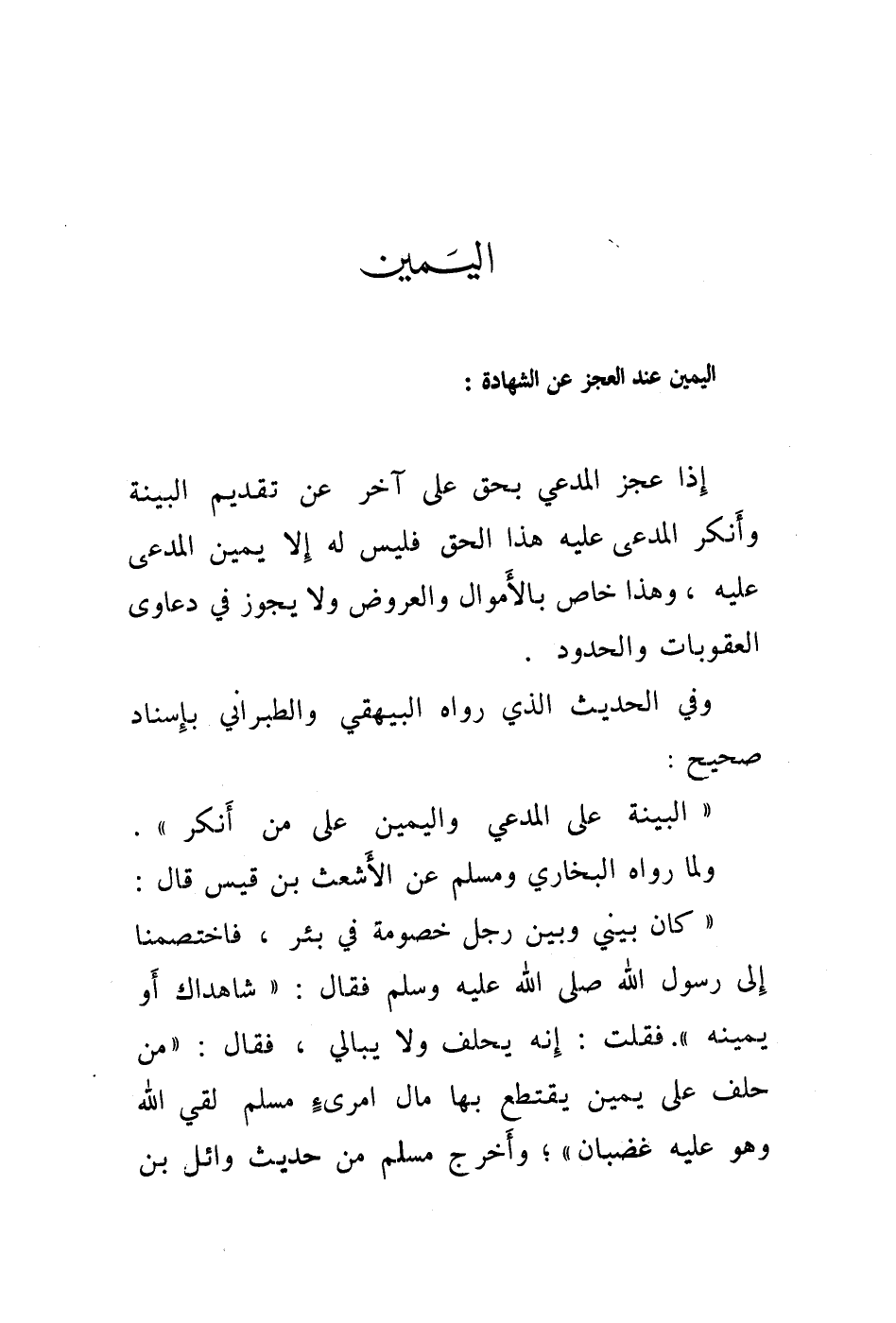 إذا عجز المدعي بحق على آخر عن تقديم البينة وأنكر المدعى عليه هذا الحق فليس له إلا يمين المدعى عليه، وهذا خاص بالاموال والعروض ولايجوز في دعاوى العقوبات والحدود وفي الحديث الذي رواه البيهقي والطبراني بإسناد صحيح: " البينة على المدعي واليمين على من أنكر ".