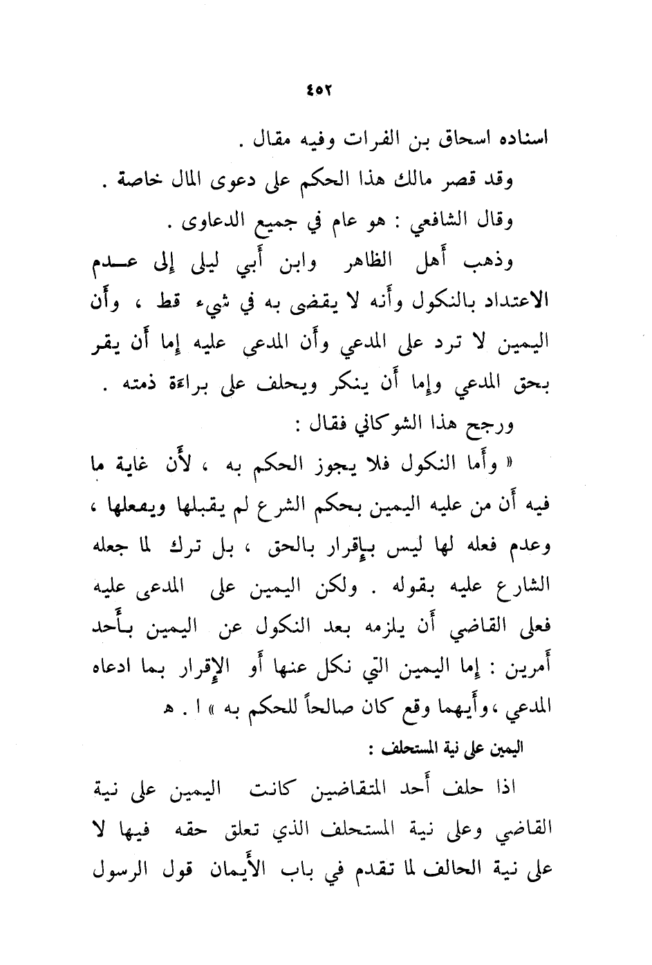 الاعتداد بالنكول وأنه لا يقضى به في شئ قط، وأن اليمين لاترد على المدعي وأن المدعى عليه إما أن يقر بحق المدعي وإما أن ينكر ويحلف على براءة ذمته.