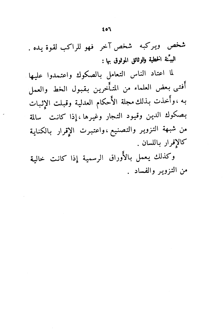 لما اعتاد الناس التعامل بالصكوك واعتمدوا عليها أفتى بعض العلماء من المتأخرين بقبول الخط والعمل به، وأخذت بذلك مجلة الاحكام العدلية وقبلت الاثبات بصكوك الدين وقيود التجار وغيرها، إذا كانت سالمة من شبهة التزوير والتصنيع، واعتبرت الاقرار بالكناية كالاقرار باللسان.