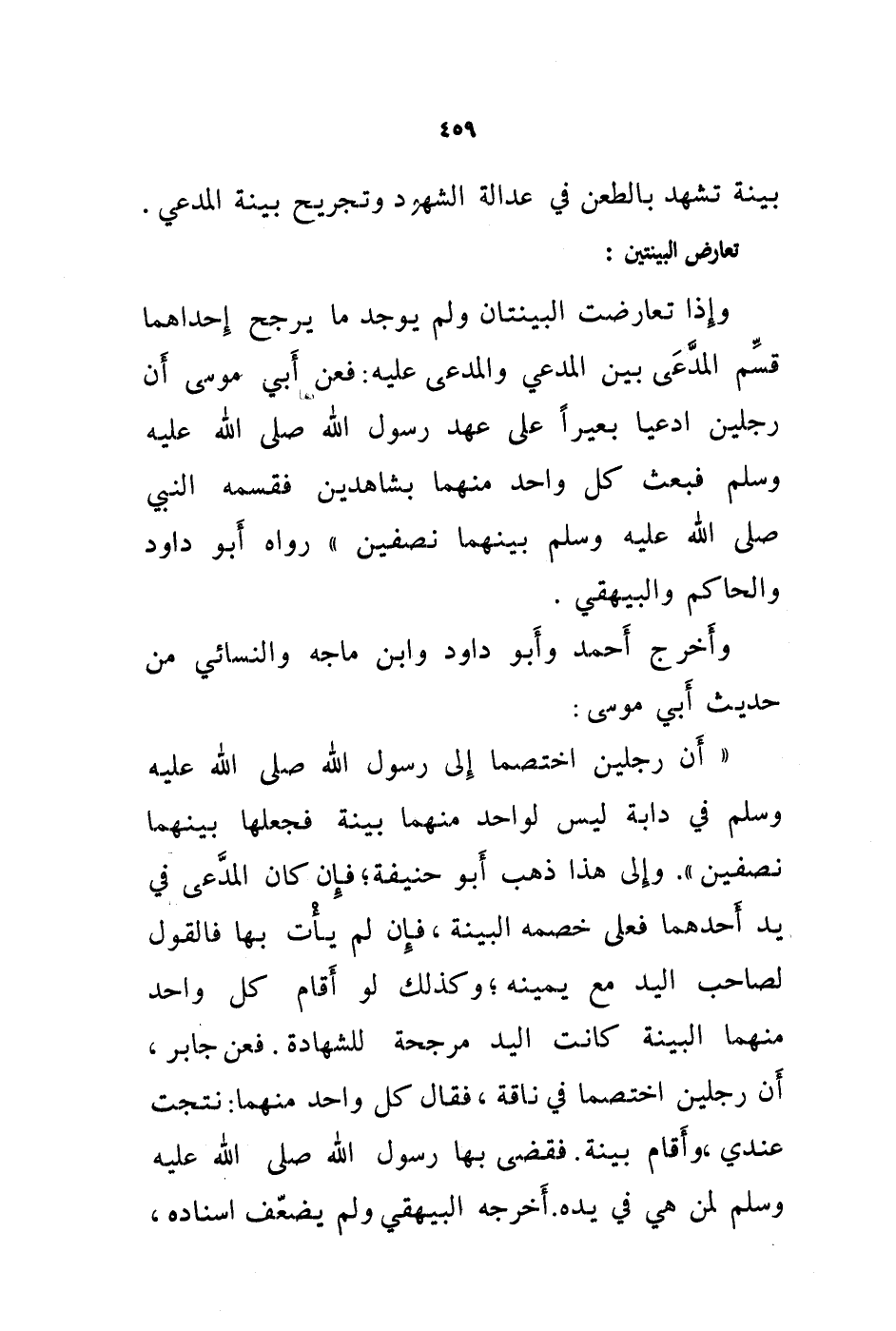 وإذا تعارضت البينتان ولم يوجد ما يرجح إحداهما قسم المدعى بين المدعي والمدعى عليه: فعن أبي موسى أن رجلين ادعيا بعيرا على عهد رسول الله صلى الله عليه وسلم فبعث كل واحد منهما بشاهدين فقسمه النبي صلى الله عليه وسلم بينهما نصفين " رواه أبو داود والحاكم والبيهقي.