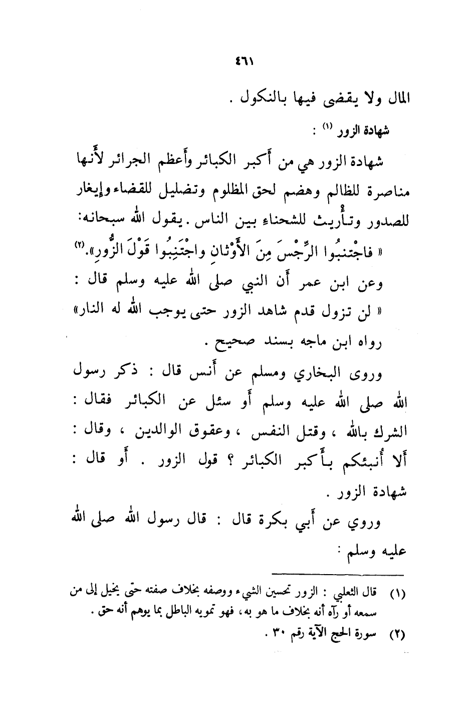 يقول الله سبحانه: " فاجتنبوا الرجس من الاوثان واجتنبوا قول الزور " (2) وعن ابن عمر أن النبي صلى الله عليه وسلم قال: " لن تزول قدم شاهد الزور حتى يوجب الله له النار " رواه ابن ماجه بسند صحيح.
