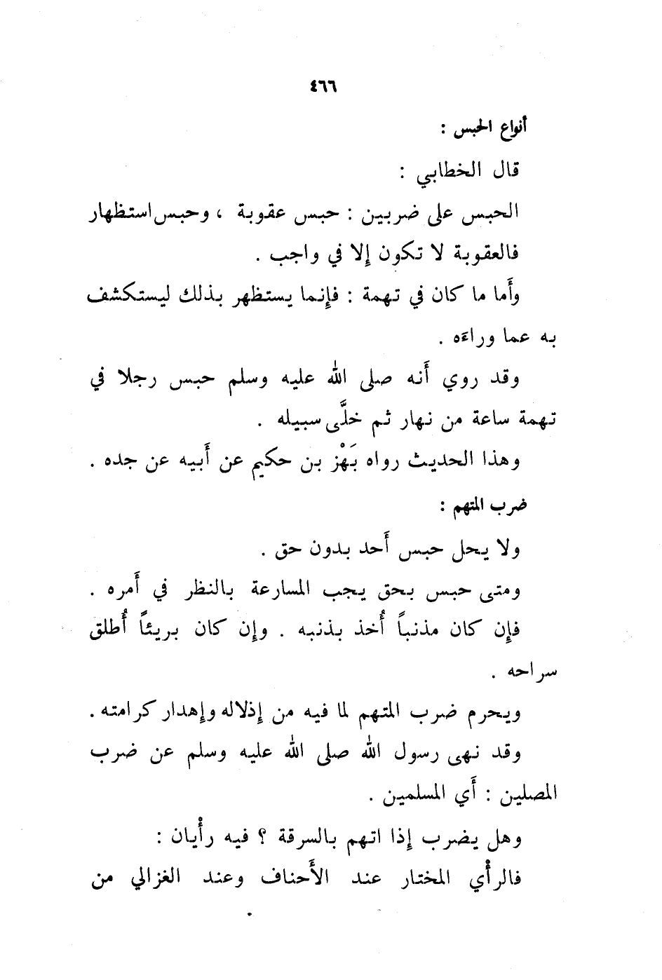 ولا يحل حبس أحد بدون حق. ومتى حبس بحق يجب المسارعة بالنظر في أمره. فإن كان مذنبا أخذ بذنبه. وإن كان بريئا أطلق سراحه. ويحرم ضرب المتهم لما فيه من إذلاله وإهدار كرامته.