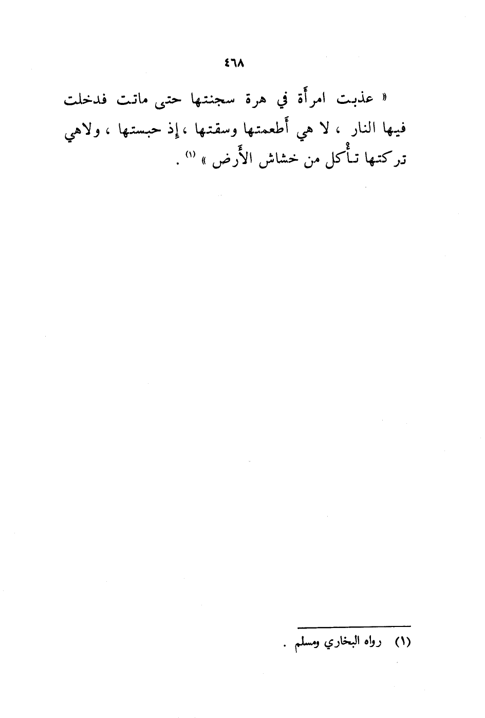 " عذبت امرأة في هرة سجنتها حتى ماتت فدخلت فيها النار، لاهي أطعمتها وسقتها، إذ حبستها، ولاهي تركتها تأكل من خشاش الارض " (1) .