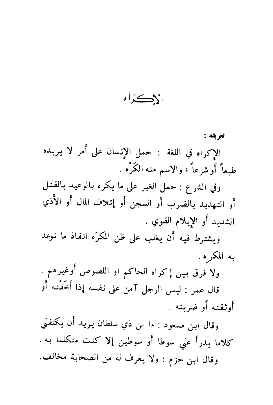 تعريفه: الاكراه في اللغة: حمل الانسان على أمر لا يريده طبعا أو شرعا، والاسم منه الكره.