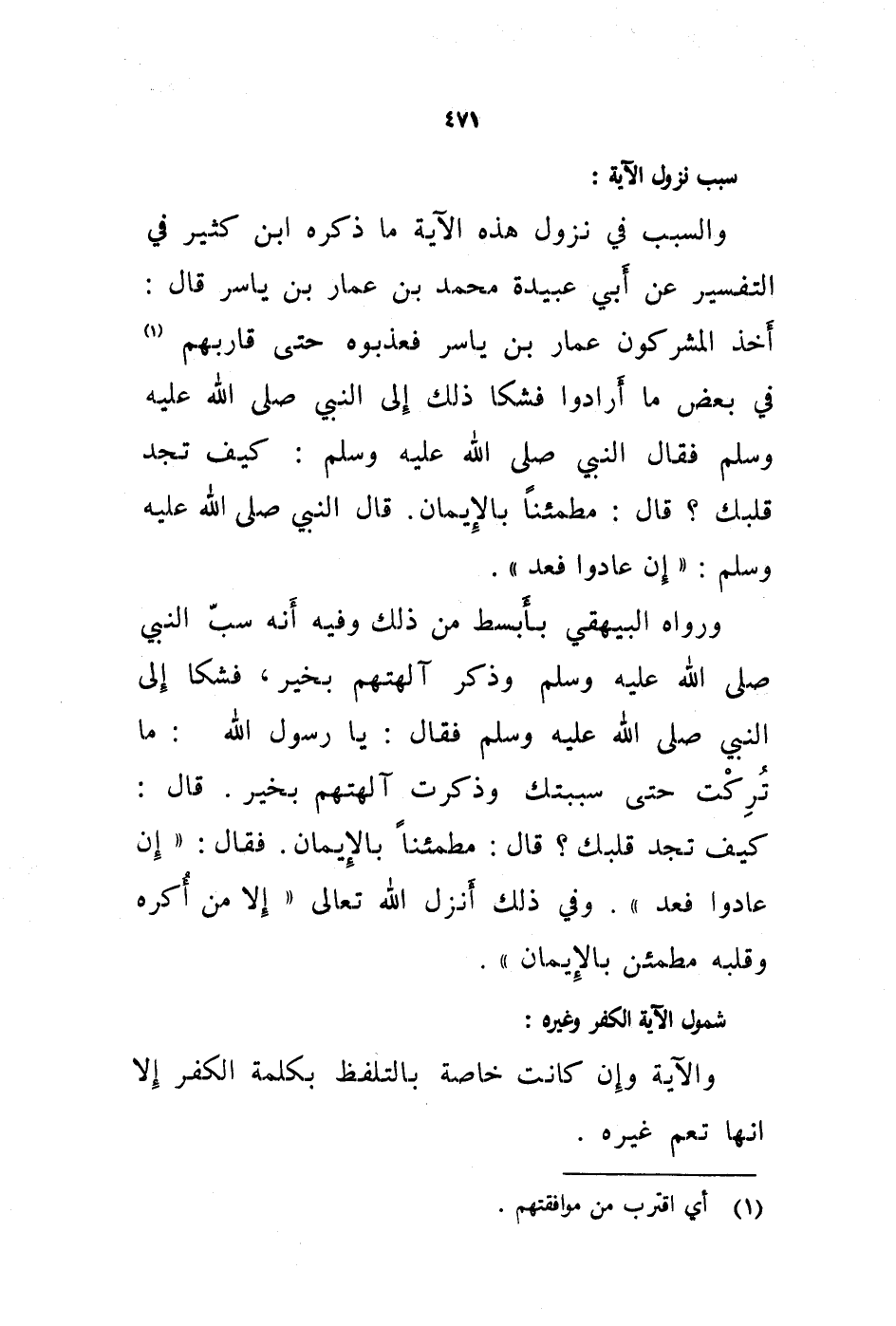 ورواه البيهقي بأبسط من ذلك وفيه أنه سب النبي صلى الله عليه وسلم وذكر آلهتهم بخير، فشكا إلى النبي صلى الله عليه وسلم فقال: يارسول الله: ما تركت حتى سببتك وذكرت آلهتهم بخير. قال: كيف تجد قلبك؟ قال: مطمئنا بالايمان. فقال: " إن عادوا فعد ".وفي ذلك أنزل الله تعالى " إلا من أكره وقلبه مطمئن بالايمان ".