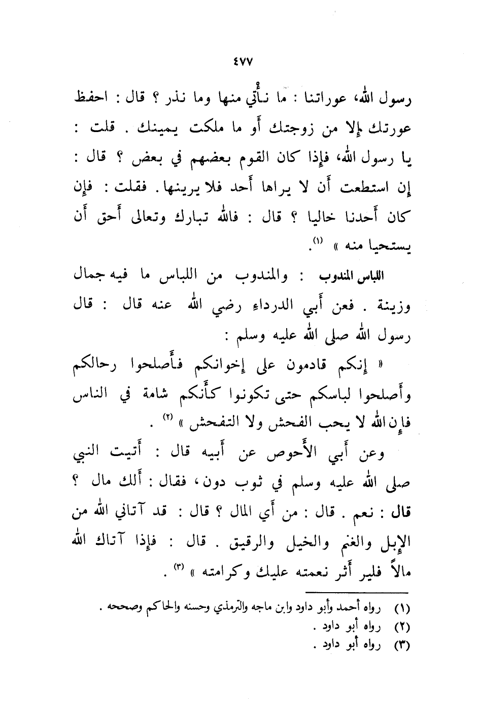 فعن أبي الدرداء رضي الله عنه قال: قال رسول الله صلى الله عليه وسلم: " إنكم قادمون على إخوانكم فأصلحوا رحالكم وأصلحوا لباسكم حتى تكونوا كأنكم شامة في الناس فإن الله لا يحب الفحش ولا التفحش " (2) وعن أبي الاحوص عن أبيه قال: أتيت النبي صلى الله عليه وسلم في ثوب دون، فقال: ألك مال؟ قال: نعم.