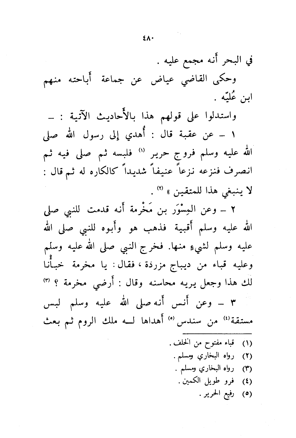 1 - عن عقبة قال: أهدي إلى رسول الله صلى الله عليه وسلم فروج حرير (1) فلبسه ثم صلى فيه ثم انصرف فنزعه نزعا عنيفا شديدا كالكاره له ثم قال: لا ينبغي هذا للمتقين " (2) .