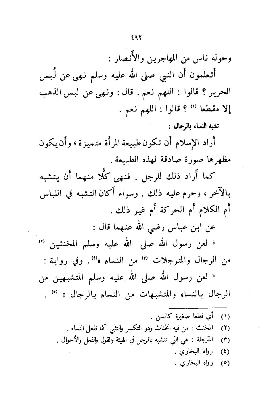 عن ابن عباس رضي الله عنهما قال: " لعن رسول الله صلى الله عليه وسلم المخنثين (2) من الرجال والمترجلات (3) من النساء " (4) .