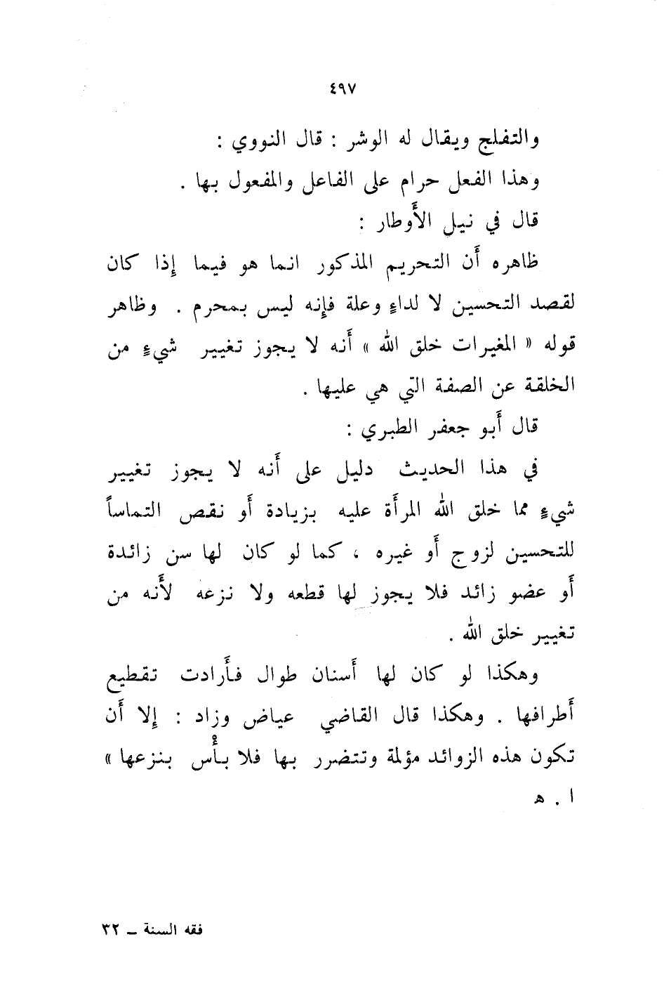 قال أبو جعفر الطبري: في هذا الحديث دليل على أنه لا يجوز تغيير شئ مما خلق الله المرأة عليه بزيادة أو نقص التماسا للتحسين لزوج أو غيره، كما لو كان لها سن زائدة أو عضو زائد فلا يجوز لها قطعه ولانزعه لانه من تغيير خلق الله.