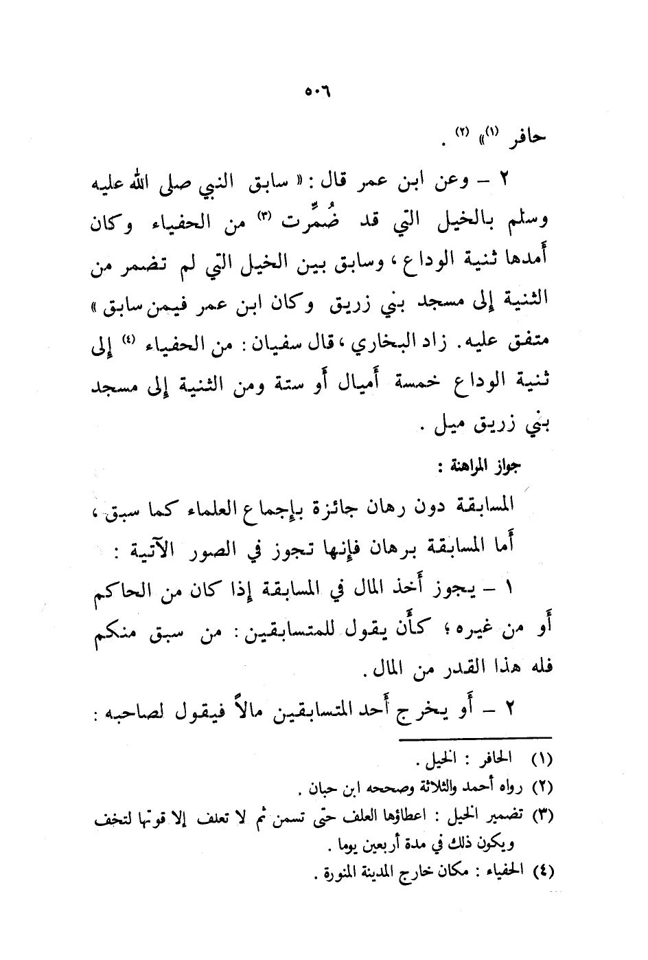 2 - وعن ابن عمر قال: " سابق النبي صلى الله عليه وسلم بالخيل التي قد ضمرت (3) من الحفياء وكان أمدها ثنية الوداع، وسابق بين الخيل التي لم تضمر من الثنية إلى مسجد بني زريق وكان ابن عمر فيمن سابق " متفق عليه.