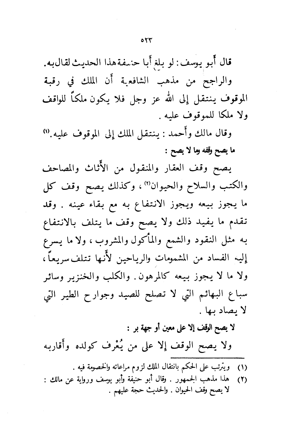 وقال مالك وأحمد: ينتقل الملك إلى الموقوف عليه. (1)