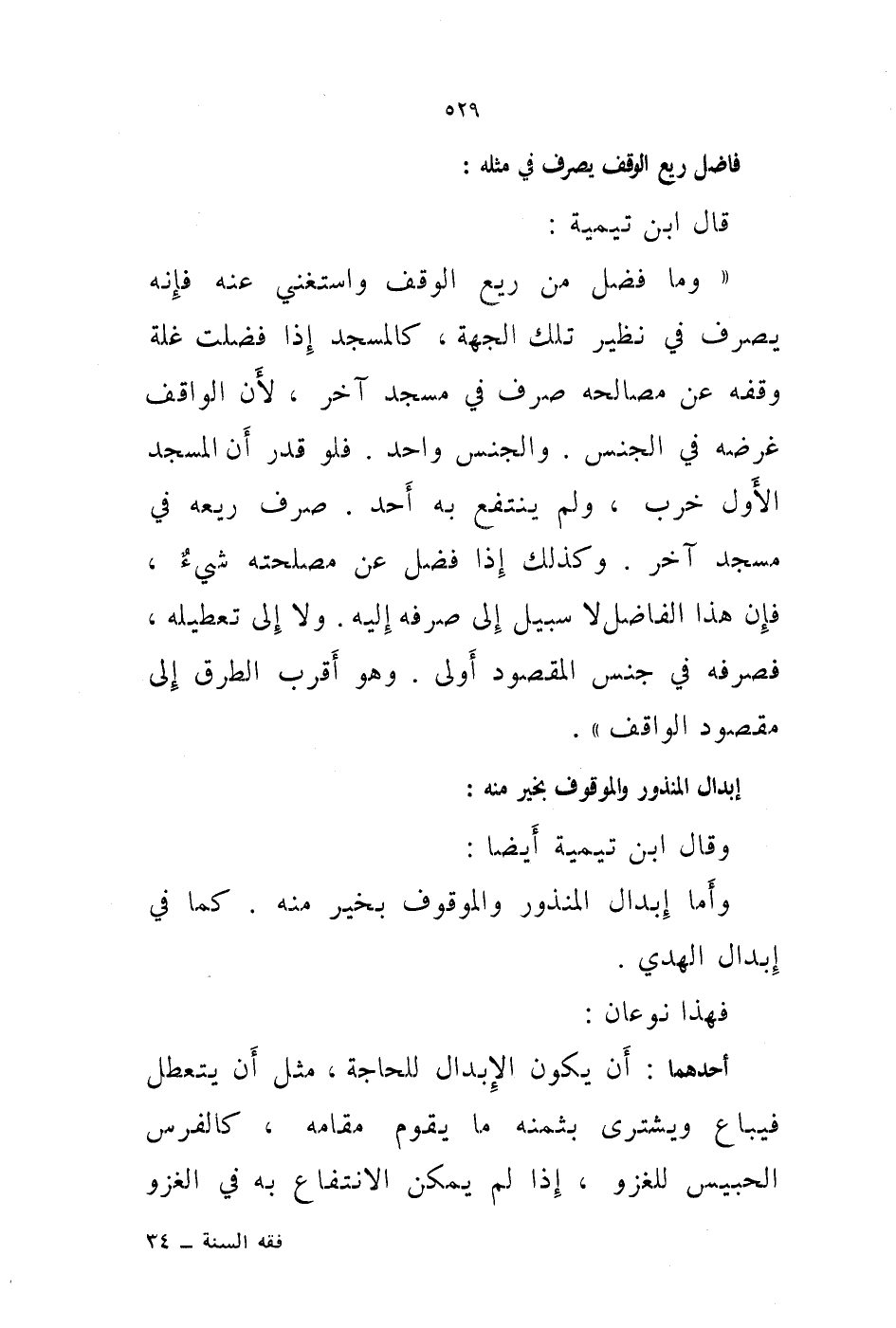 قال ابن تيمية: " وما فضل من ريع الوقف واستغني عنه فإنه يصرف في نظير تلك الجهة، كالمسجد إذا فضلت غلة وقفه عن مصالحه صرف في مسجد آخر، لان الواقف غرضه في الجنس. والجنس واحد.