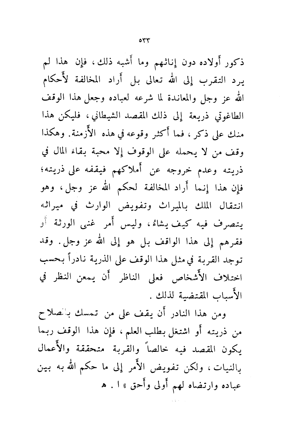 ومن هذا النادر أن يقف على من تمسك بالصلاح من ذريته أو اشتغل بطلب العلم، فإن هذا الوقف ربما يكون المقصد فيه خالصا والقربة متحققة والاعمال بالنيات، ولكن تفويض الامر إلى ما حكم الله به بين عباده وارتضاه لهم أولى وأحق " ا. هـ