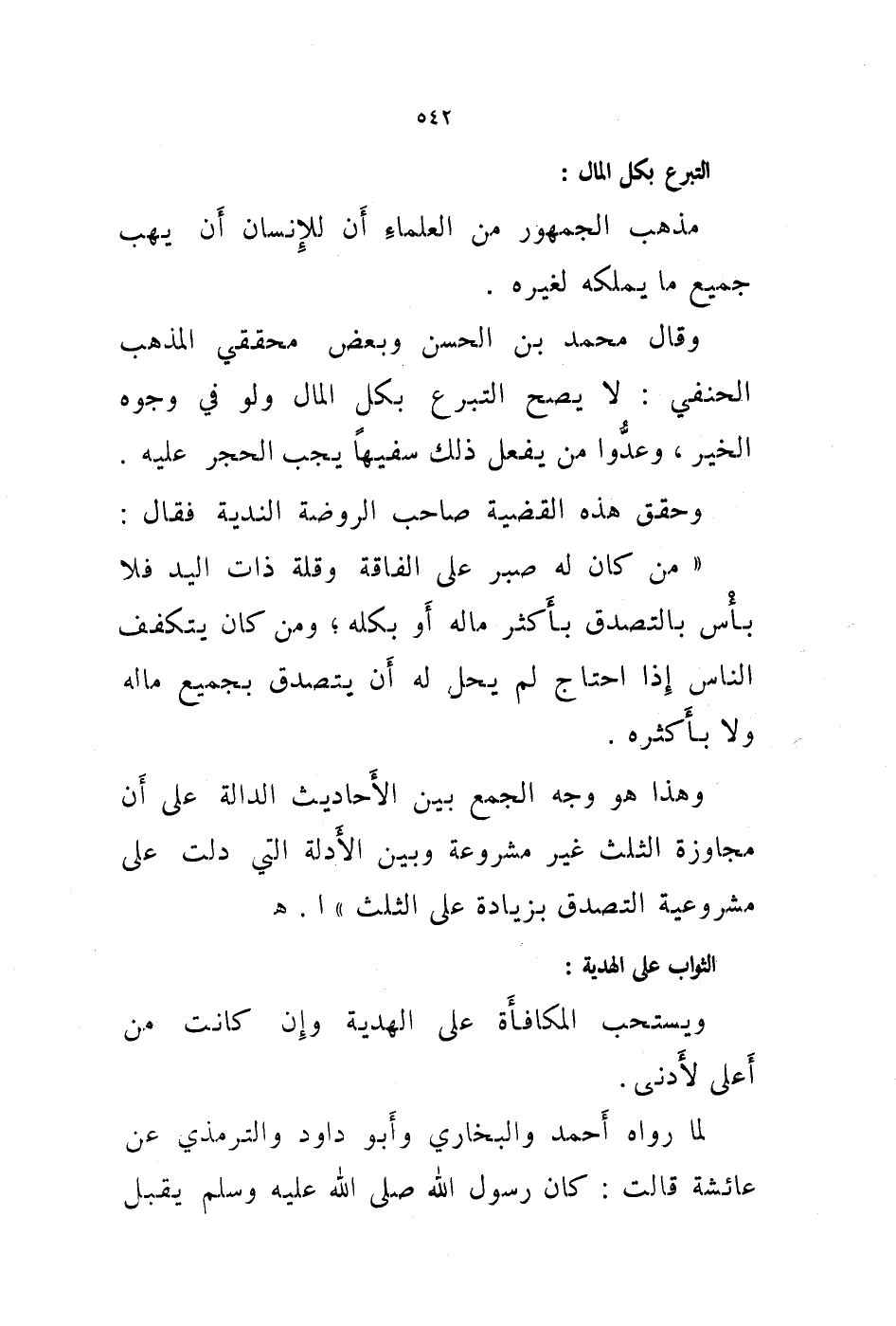 وحقق هذه القضية صاحب الروضة الندية فقال: " من كان له صبر على الفاقة وقلة ذات اليد فلا بأس بالتصدق بأكثر ماله أو بكله، ومن كان يتكفف الناس إذا احتاج لم يحل له أن يتصدق بجميع ماله ولا بأكثره.