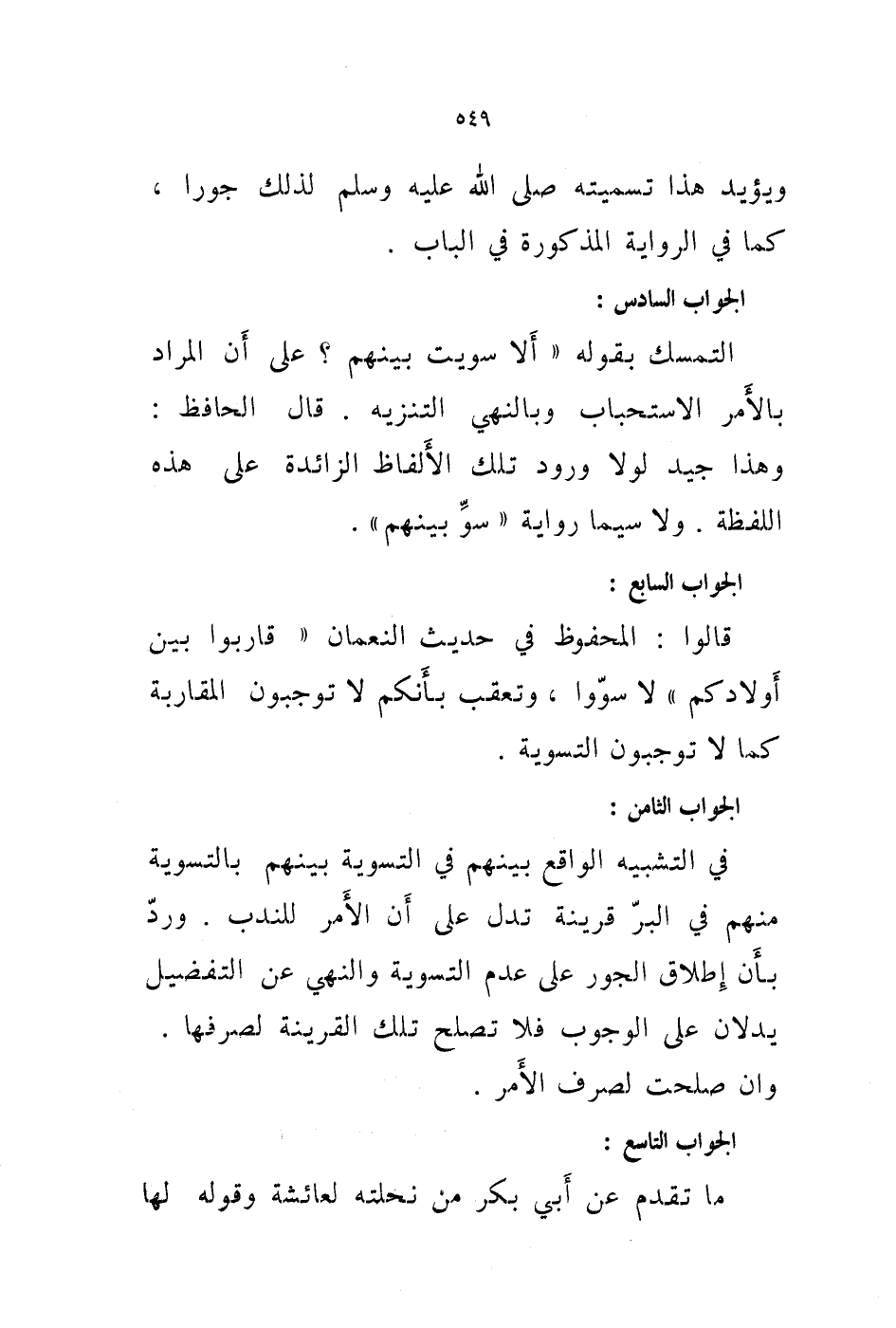 الجواب السابع: قالوا: المحفوظ في حديث النعمان " قاربوا بين أولادكم " لاسووا، وتعقب بأنكم لا توجبون المقاربة كما لا توجبون التسوية.